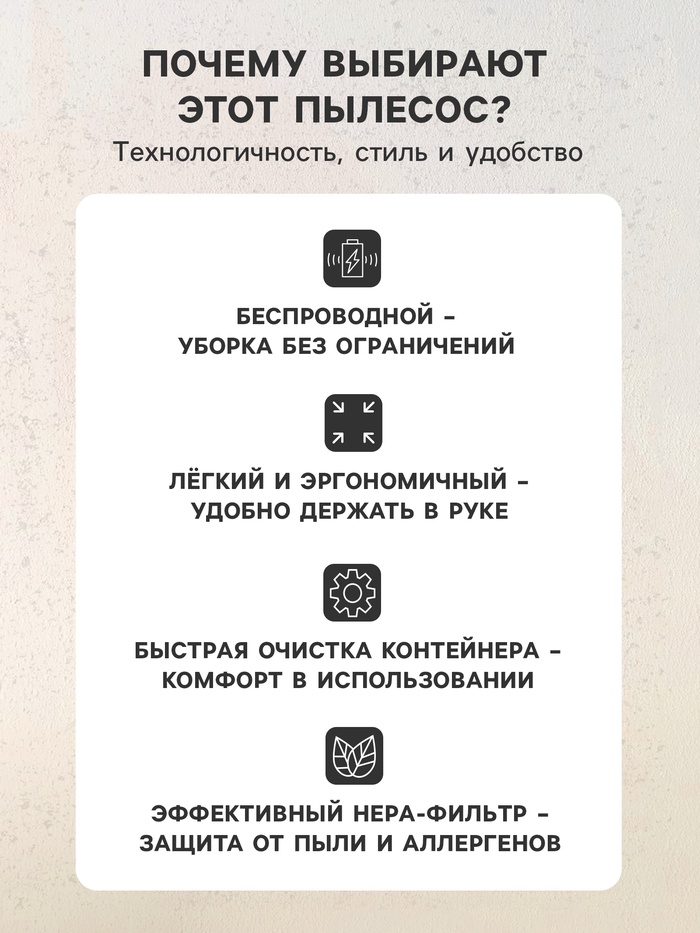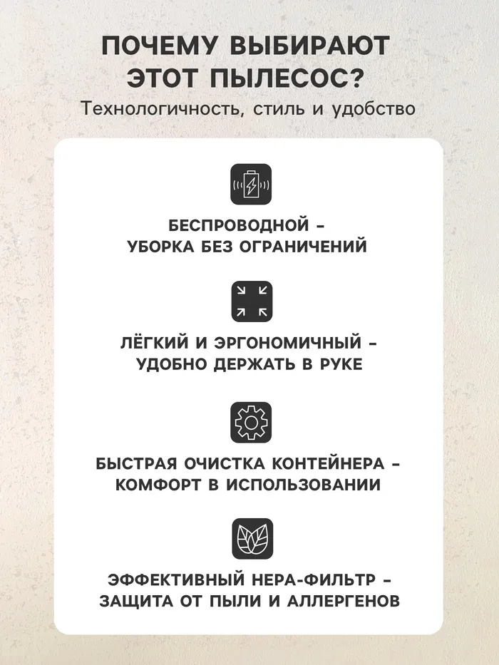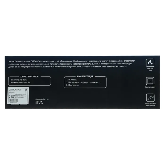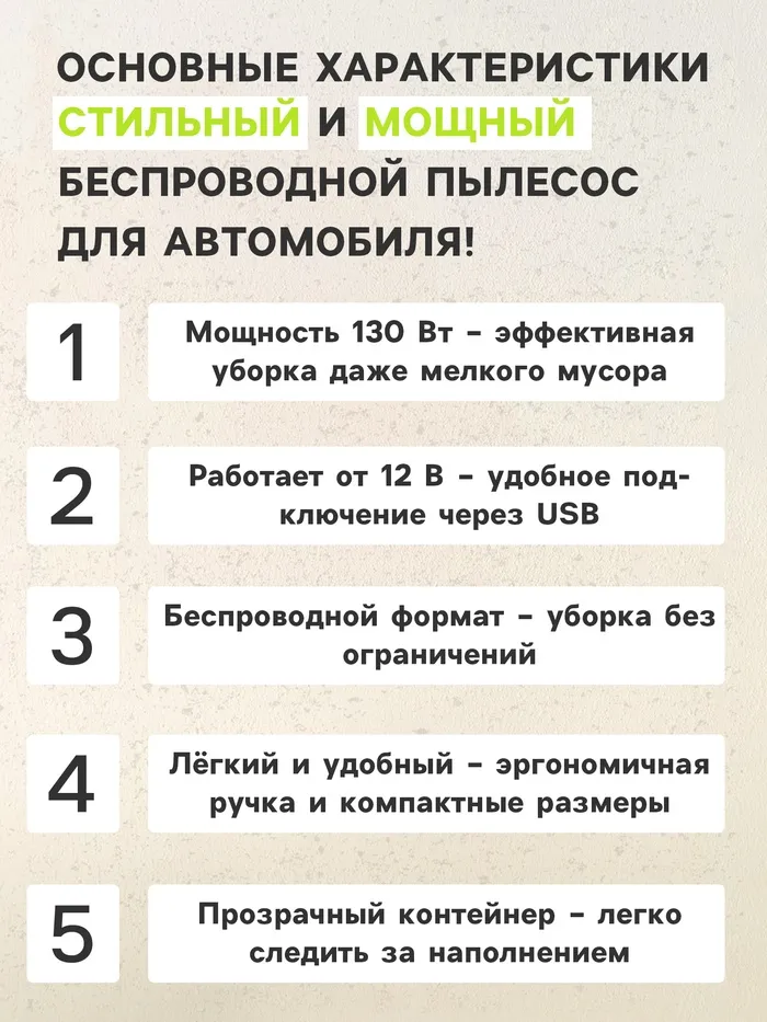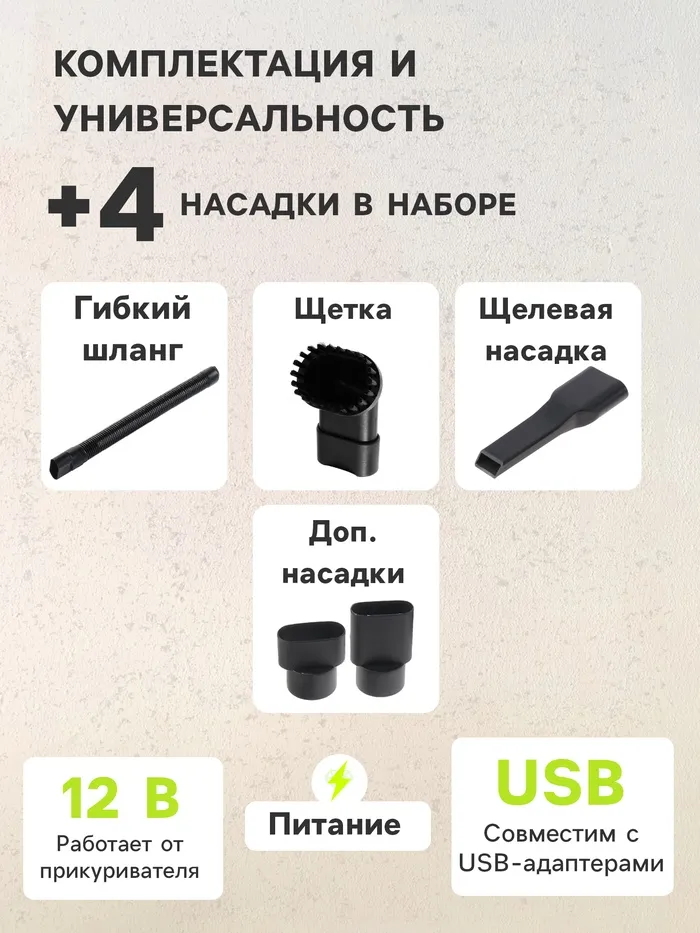 Пылесос автомобильный, беспроводной, 5 насадок, 130 Вт, 12 В, черный — Характеристики