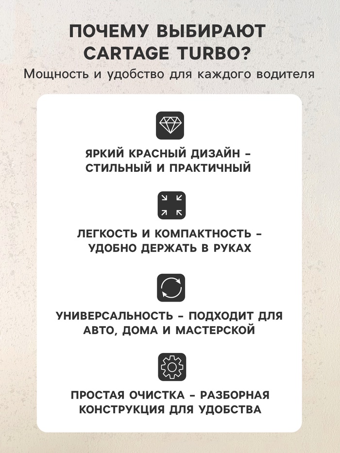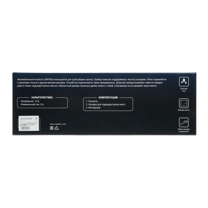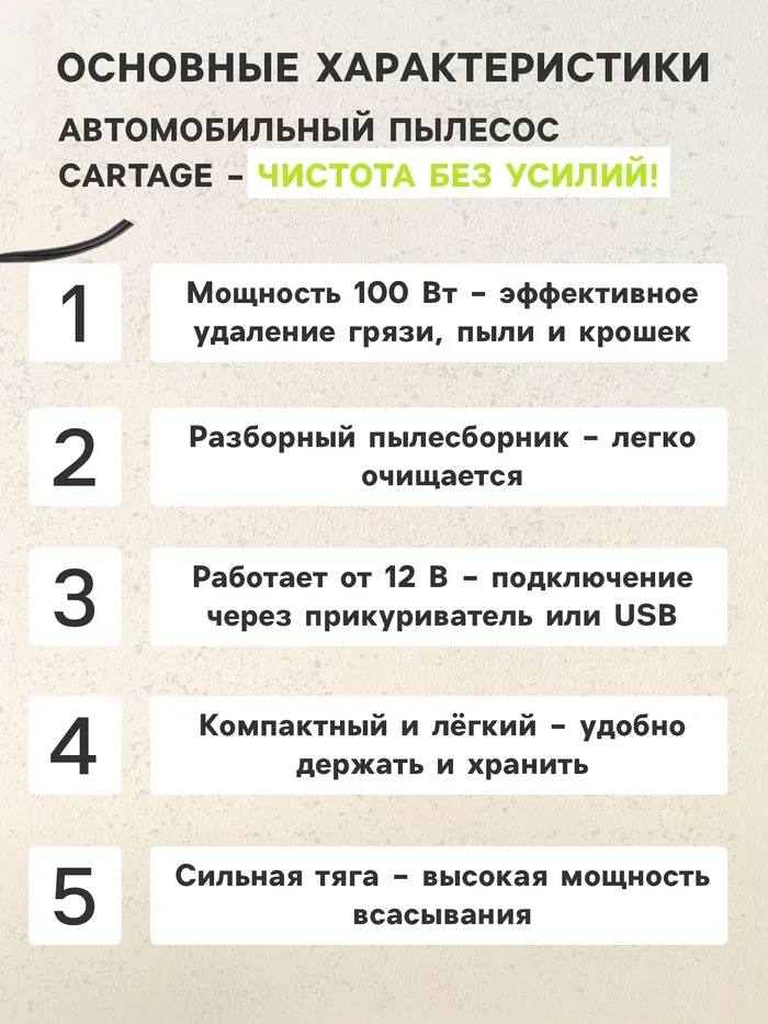 Один из самых компактных пылесосов для авто, что не мешает ему обладать серьёзной мощностью. Разумеется, устройство со 100-ваттным мотором не сравнится с домашними «монстрами», работающими от сети 220 В, но в своём классе показывает отличные результаты. Дизайн строг и одновременно симпатичен. Корпус выполнен из прочного прозрачного пластика. Работает по технологии «Циклон». Объём пылесборника – 0.3 л. В системе очистки воздуха предусмотрен HEPA фильтр, задерживающий микрочастицы до 0.3 мк. Данный аксессуар заметно упрощает очистку обивки сидений от пыли и мусора, а если в качестве пассажиров периодически выступают домашние животные, поможет устранить следы их пребывания в салоне.