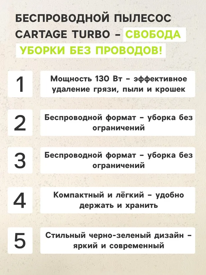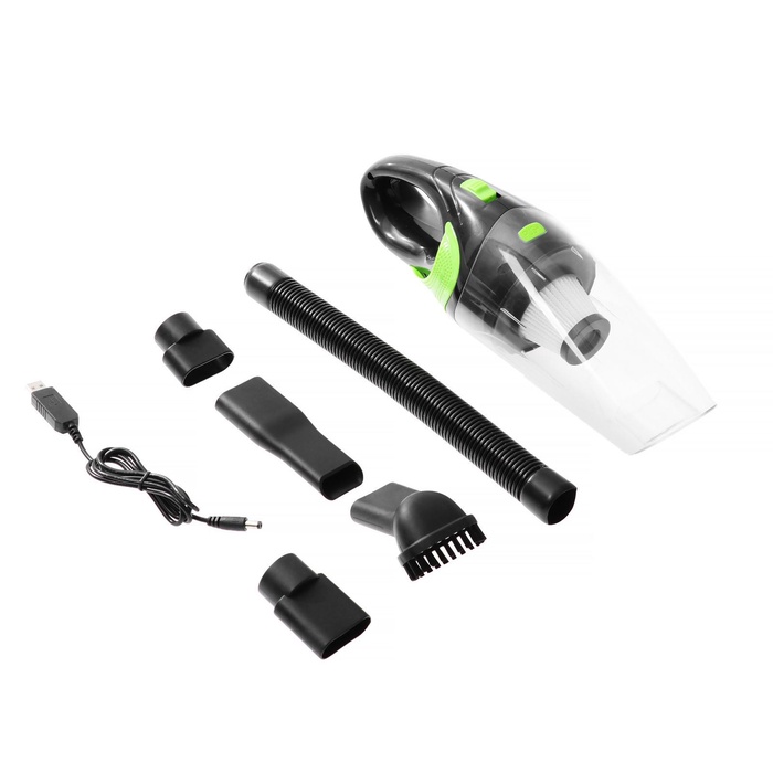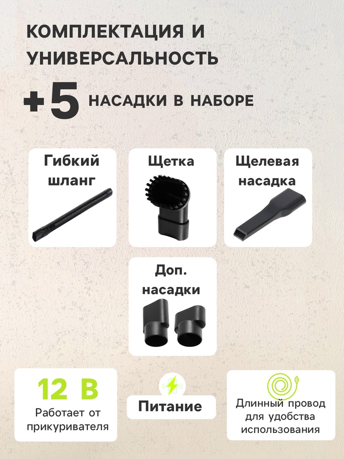 Пылесос автомобильный CARTAGE, беспроводной, 5 насадок, 130 Вт, 12 В, черно-зеленый — Характеристики