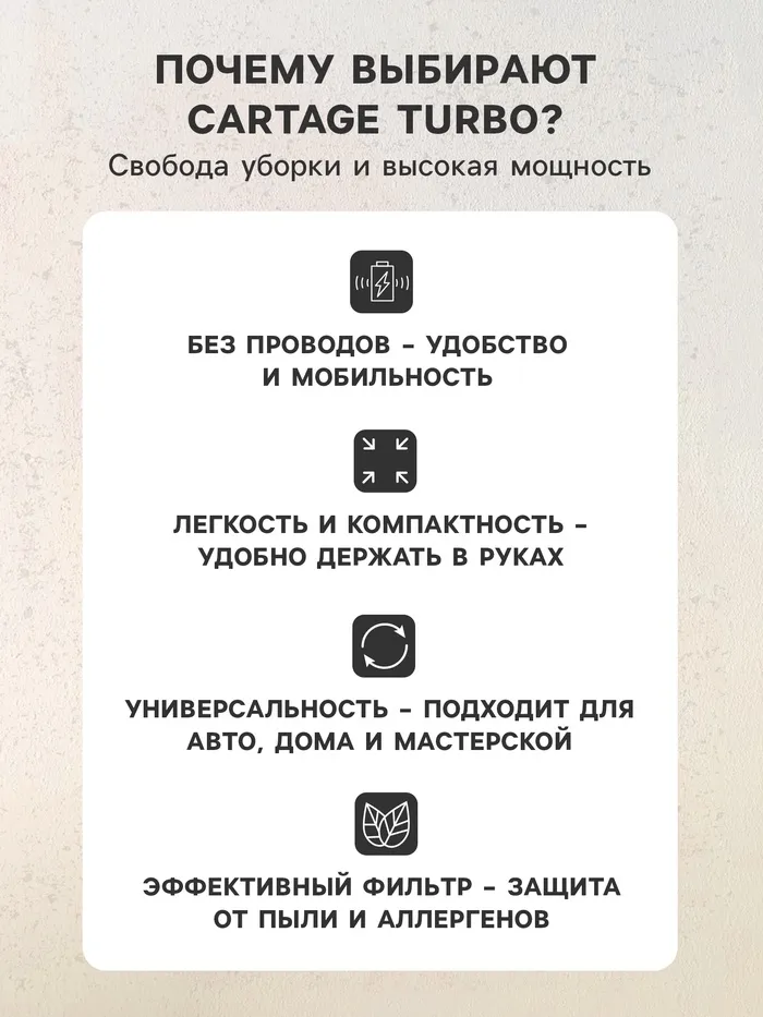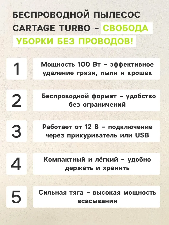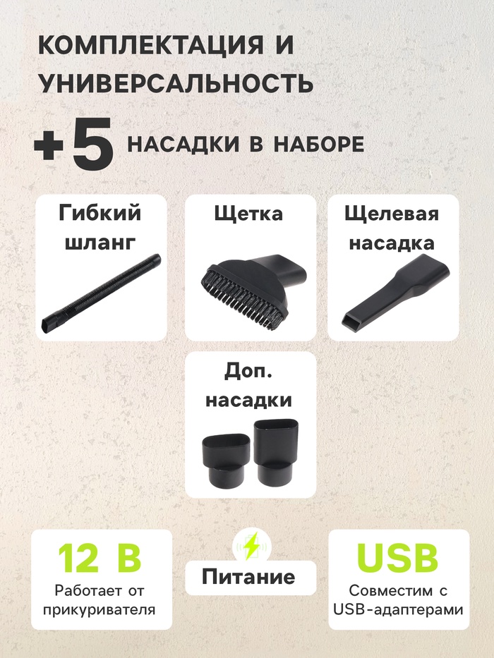 Один из самых компактных пылесосов для авто, что не мешает ему обладать серьёзной мощностью. Разумеется, устройство со 100-ваттным мотором не сравнится с домашними «монстрами», работающими от сети 220 В, но в своём классе показывает отличные результаты. Дизайн строг и одновременно симпатичен. Корпус выполнен из прочного прозрачного пластика. Работает по технологии «Циклон». Объём пылесборника – 0.3 л. В системе очистки воздуха предусмотрен HEPA фильтр, задерживающий микрочастицы до 0.3 мк. Данный аксессуар заметно упрощает очистку обивки сидений от пыли и мусора, а если в качестве пассажиров периодически выступают домашние животные, поможет устранить следы их пребывания в салоне.
