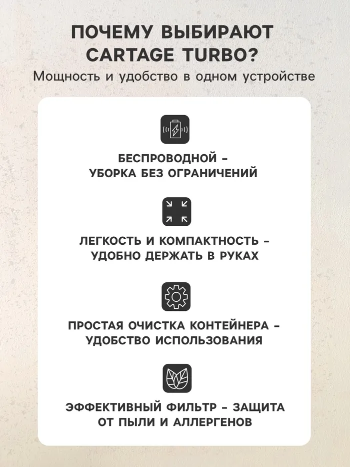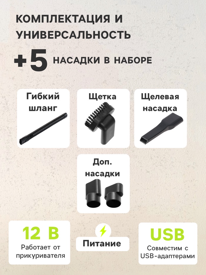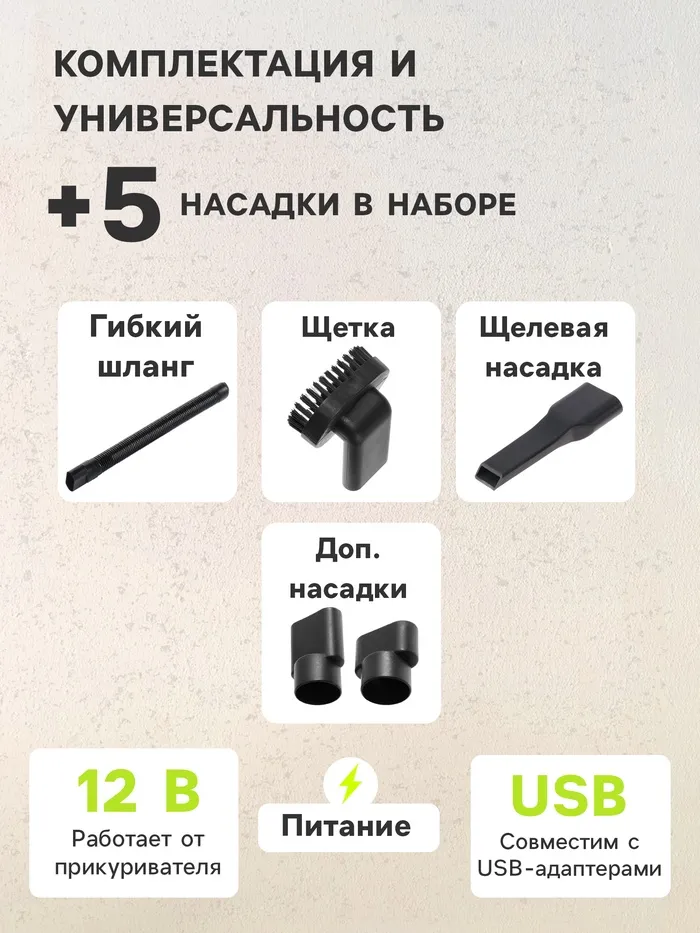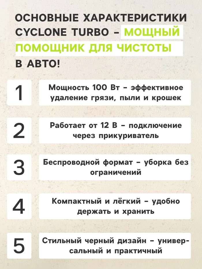 Пылесос автомобильный CYCLONE TURBO, беспроводной, 100 Вт, 12 В, черный — Характеристики