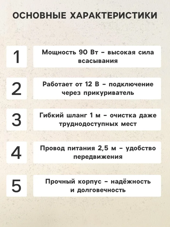 • Мощность 90 Вт позволяет собрать пыль, песок, пепел даже из самых труднодоступных мест салона.