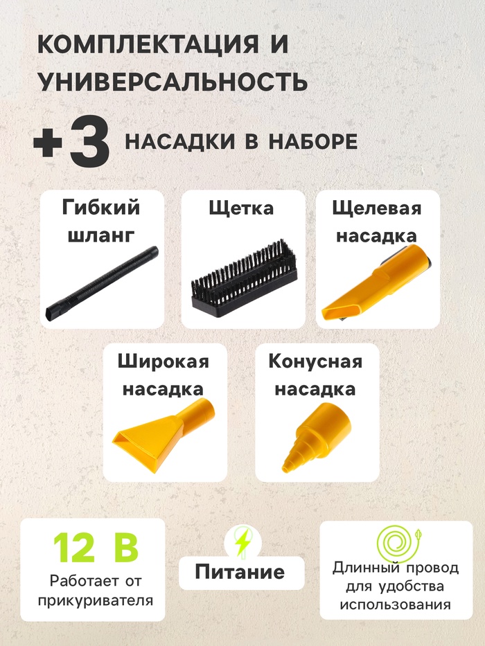 • Питание от бортовой электросети легкового автомобиля 12В позволяет пользоваться пылесосом в любом удобном для вас месте.