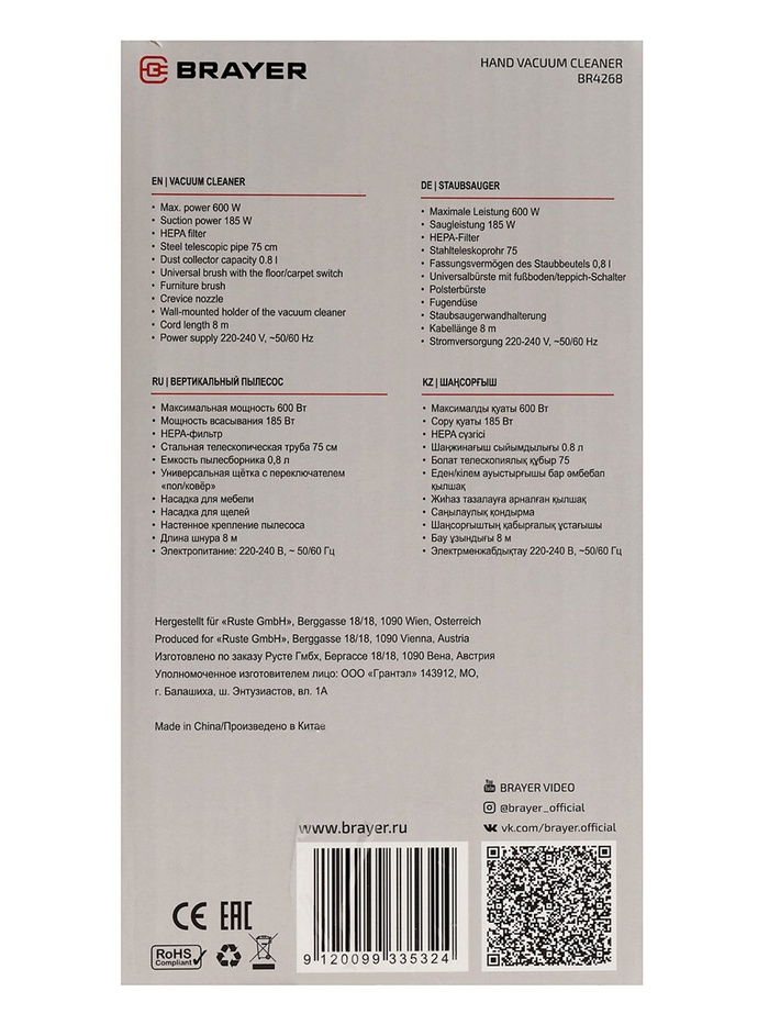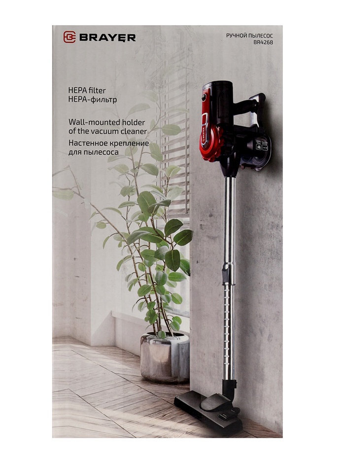 Пылесос BRAYER 4268BR, вертикальный, 600 Вт, 0.8 л, 70 дБ, 8 м, 2.8 кг, 2 насадки — Характеристики