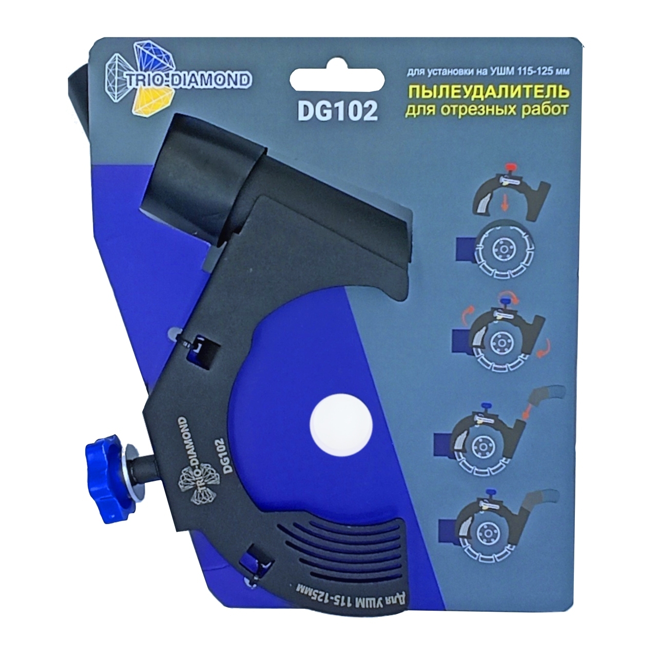 Пылеудалитель DG102 от TRIO-DIAMOND — идеальное решение для мастеров, работающих с угловыми шлифмашинами (УШМ) в диапазоне 115-125 мм. Незаменим на стройплощадках и в мастерских, где важно поддерживать чистоту при отрезных работах.