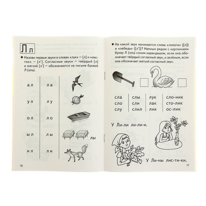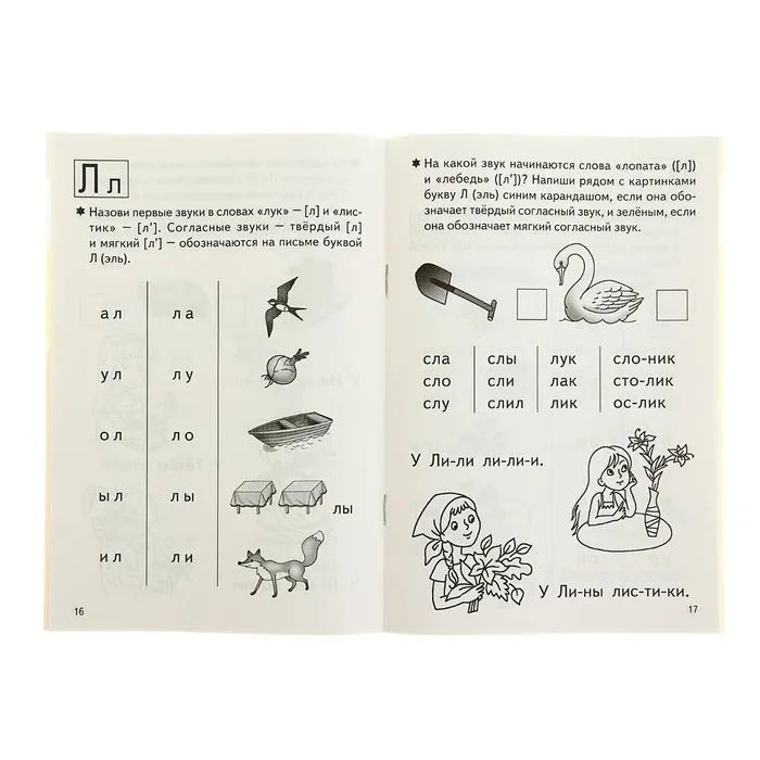 - Рисунки-опоры помогают освоить слоги, а во второй части тетради они исчезают, закрепляя навык чтения.