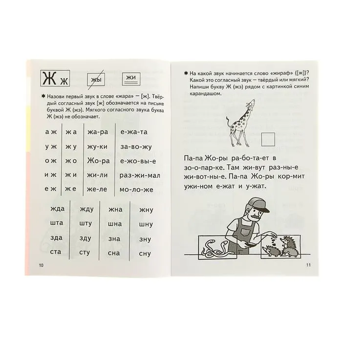 - Освоение слогового чтения: тетрадь включает слоги-слияния (согласный + гласный), которые сопровождаются яркими иллюстрациями для лучшего запоминания.