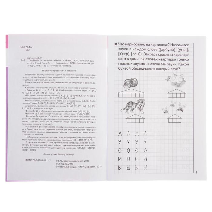 Рабочая тетрадь для детей 5-6 лет «Развиваем навыки чтения и грамотного письма», 1 часть, Бортникова Е. — Характеристики