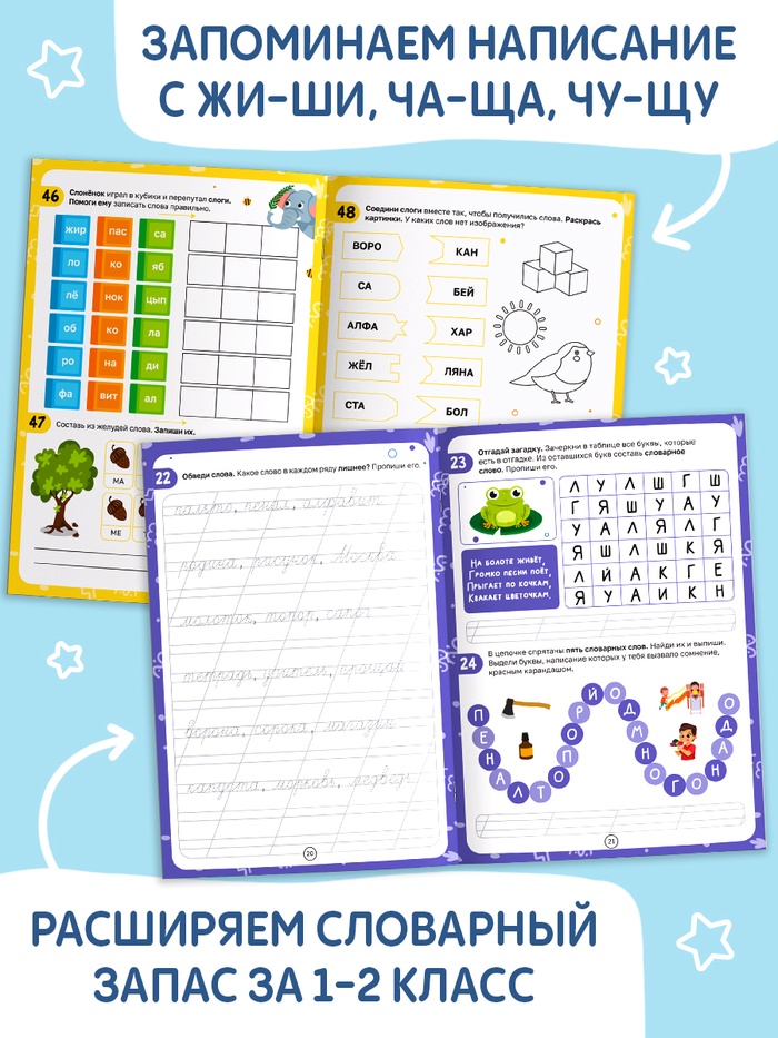 Тренажёр «Нескучные слова. Правописание словарных слов» — это рабочая тетрадь для учеников 1-2 класса, которая помогает освоить написание сложных слов и правил русского языка. 44 страницы содержат увлекательные задания, направленные на запоминание слов с «жи-ши», «ча-ща», «чу-щу» и расширение словарного запаса.