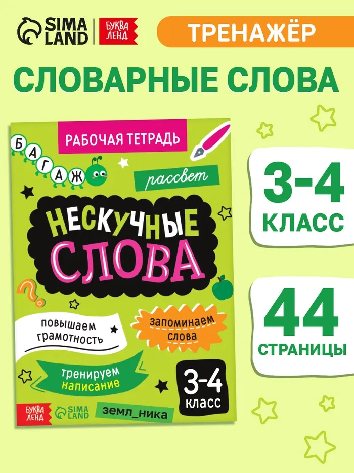 Тренажёр «Нескучные слова. Правописание словарных слов» для 3-4 класса — это рабочая тетрадь, которая помогает ученикам освоить написание сложных слов и расширить словарный запас. 44 страницы содержат увлекательные задания, направленные на развитие памяти и грамотности.