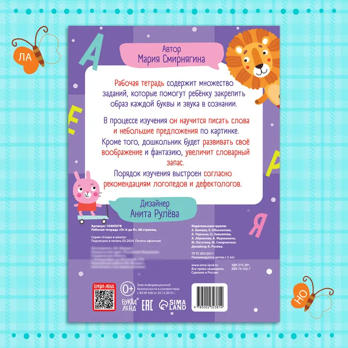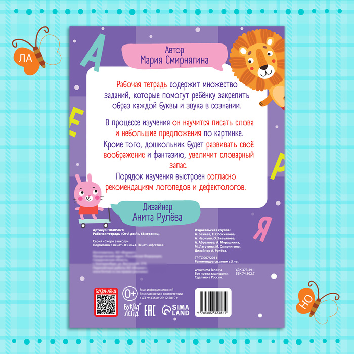 Рабочая тетрадь «От А до Я» — отличный инструмент для развития ключевых навыков у ребёнка. Издание помогает малышу освоить буквы, научиться читать и развивать память. Материалы подобраны с учётом возрастных особенностей детей от 5 лет, что делает её полезным помощником в подготовке к школе.