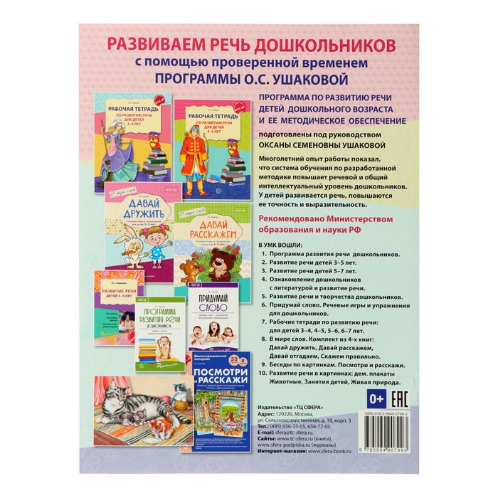 В авторской программе профессора, доктора педагогических наук Оксаны Семёновны Ушаковой «Развитие речи детей дошкольного возраста» рассмотрены возрастные особенности развития речи детей 3–7 лет. Игровая форма подачи материала помогает ребёнку формировать лексический запас, он легче усваивает грамматические категории. Принцип построения заданий, от простого к сложному, помогает развивать у детей интерес к родному языку, способствует тренировке воображения, логики и речевой активности.