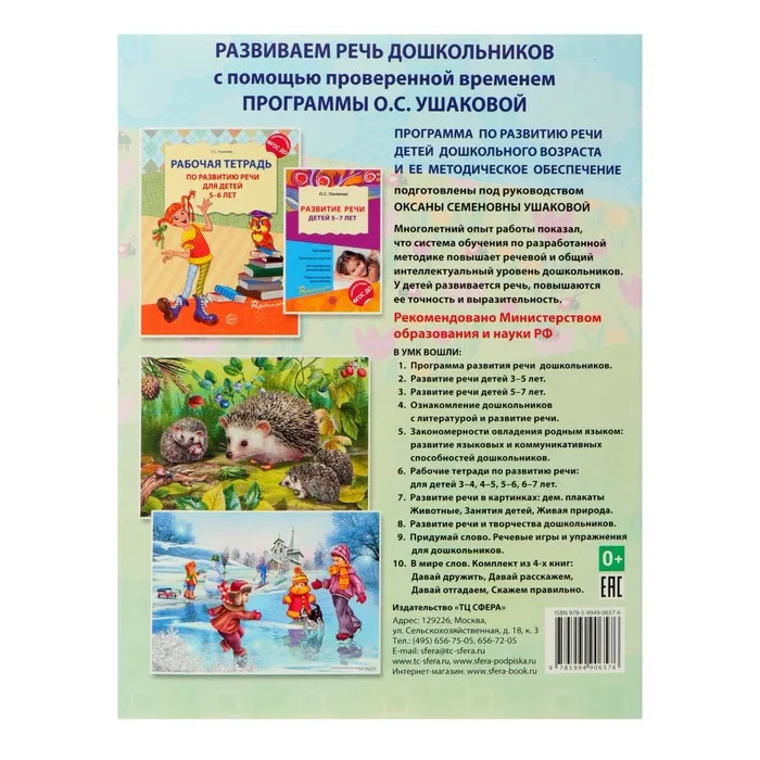 В авторской программе профессора, доктора педагогических наук Оксаны Семеновны Ушаковой «Развитие речи детей дошкольного возраста» рассмотрены возрастные особенности развития речи детей 3–7 лет. Игровая форма подачи материала помогает ребёнку формировать лексический запас, он легче усваивает грамматические категории. Принцип построения заданий – от простого к сложному, помогает развивать у детей интерес к родному языку, способствует тренировке воображения, логики и речевой активности.