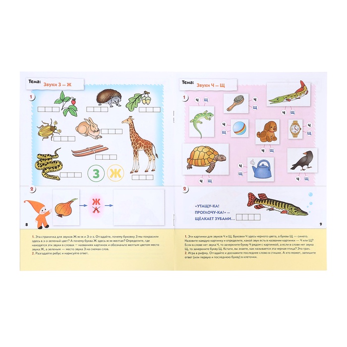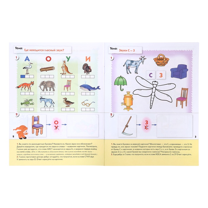 Тетрадь помогает развивать слуховое восприятие, внимание к звукам в словах и логическое мышление. Ребёнок учится определять, с какого звука начинается слово, запоминает разницу между гласными и согласными, знакомится с особенностями твёрдых и мягких звуков.