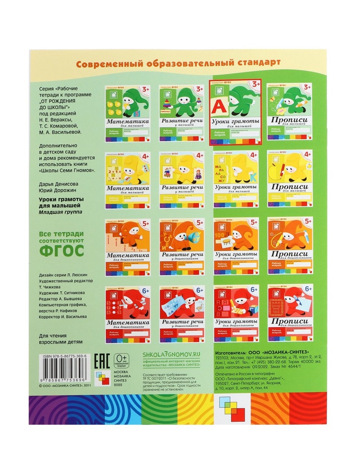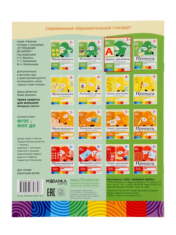 Рабочая тетрадь «Уроки грамоты для малышей», младшая группа, Денисова Д., Дорожин Ю., МИКС — Характеристики