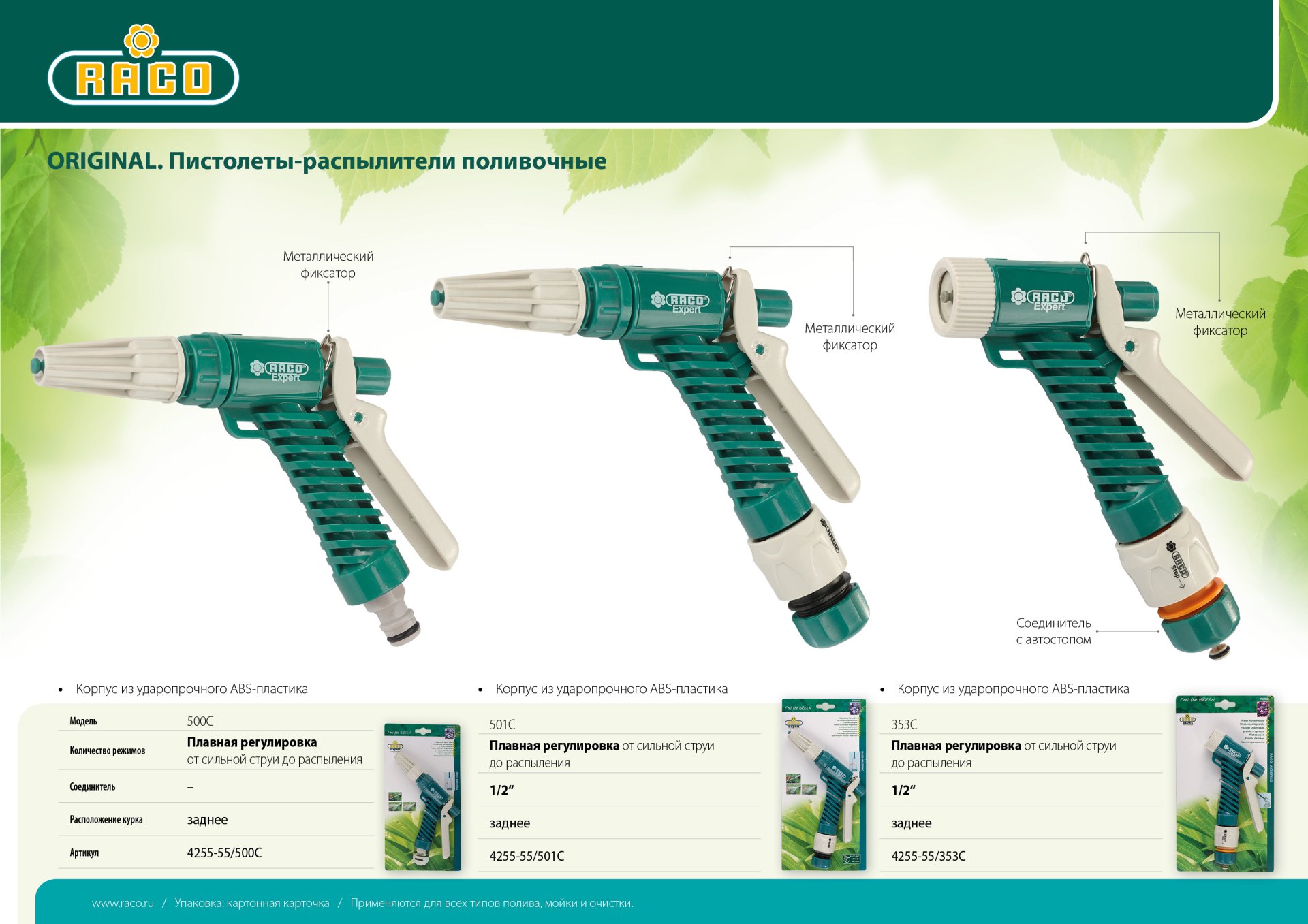 Поливочные пистолеты-распылители RACO Original являются самыми распространёнными и доступными. Изготовлены из надёжных материалов, обладают высоким уровнем качества.