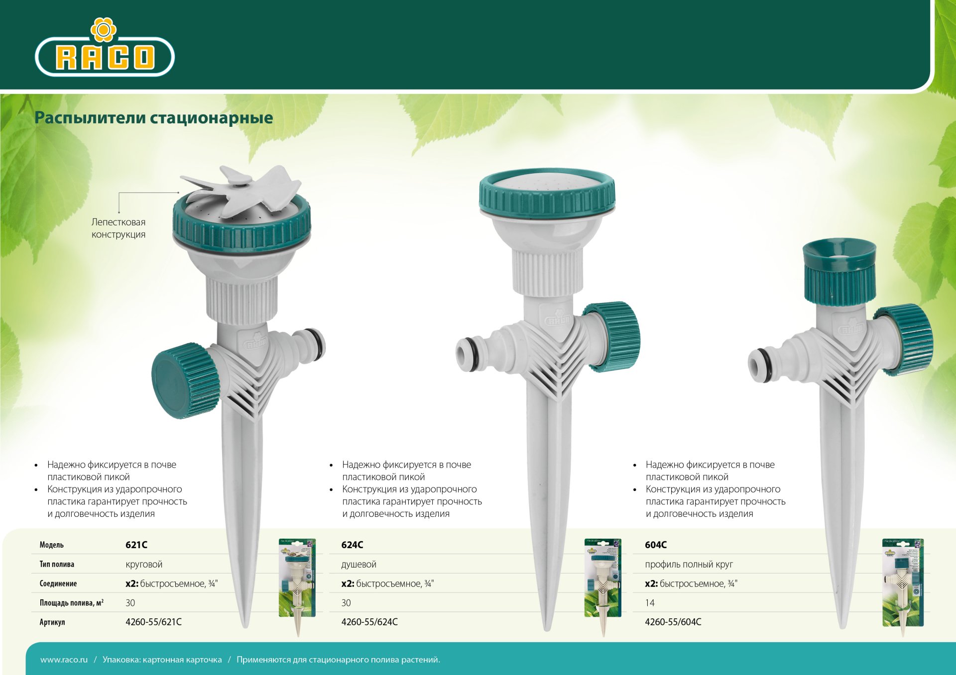 Стационарные распылители RACO обладают высоким уровнем качества, изготовлены из качественных материалов. Надёжны в работе, служат долго, исключительно удобны в использовании. Обеспечивают простое и качественное подключение к поливочной системе. Широкий ассортимент моделей для всех видов полива.