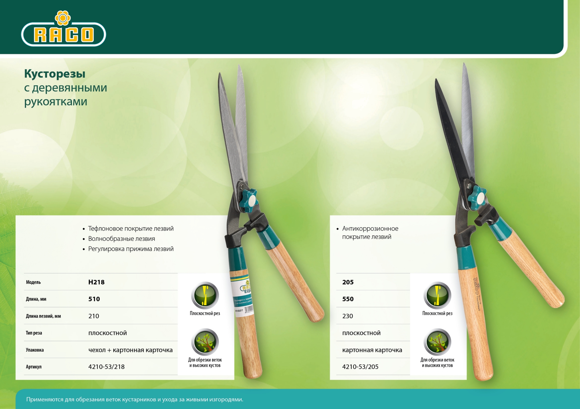 Кусторезы RACO изготовлены из современных и качественных материалов. Обеспечивают чистый рез, удобны в работе, надежны, с длительным сроком службы.