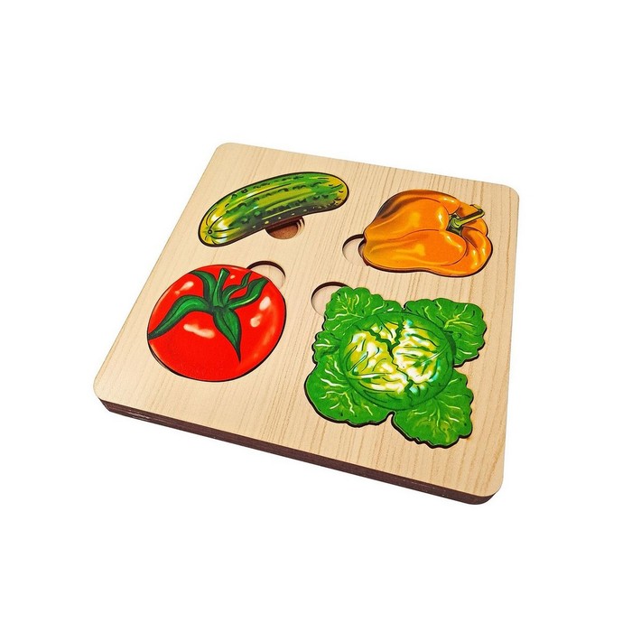 Попросите ребёнка перечислить овощи, расположенных на доске. Как можно назвать их одним словом? Затем переверните доску, разложите вкладыши на столе и предложите малышу отложить отдельно помидорки, капусту, огурцы и перцы.