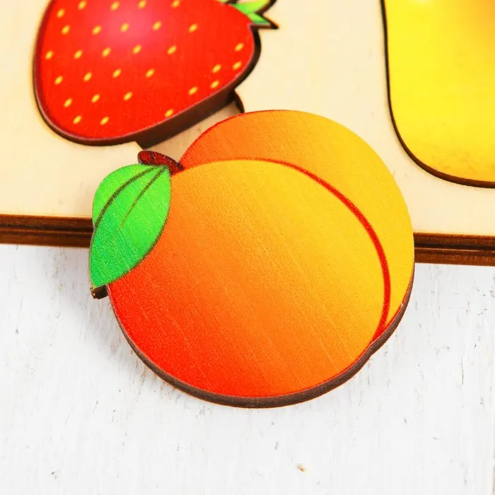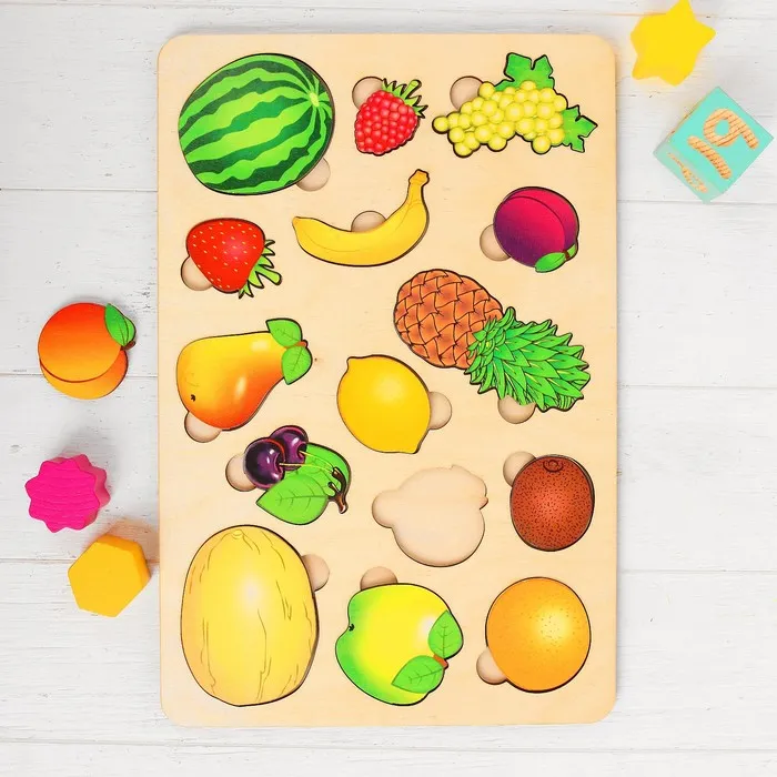 Разместите рамку перед ребёнком и предложите ему подобрать элементы в соответствии с формой. Этот простой процесс помогает ребёнку научиться сосредотачиваться, мыслить логически и решать задачи самостоятельно. Вы также можете сопровождать игру увлекательными историями о фруктах, изображённых на вкладышах, что сделает процесс обучения ещё интереснее.