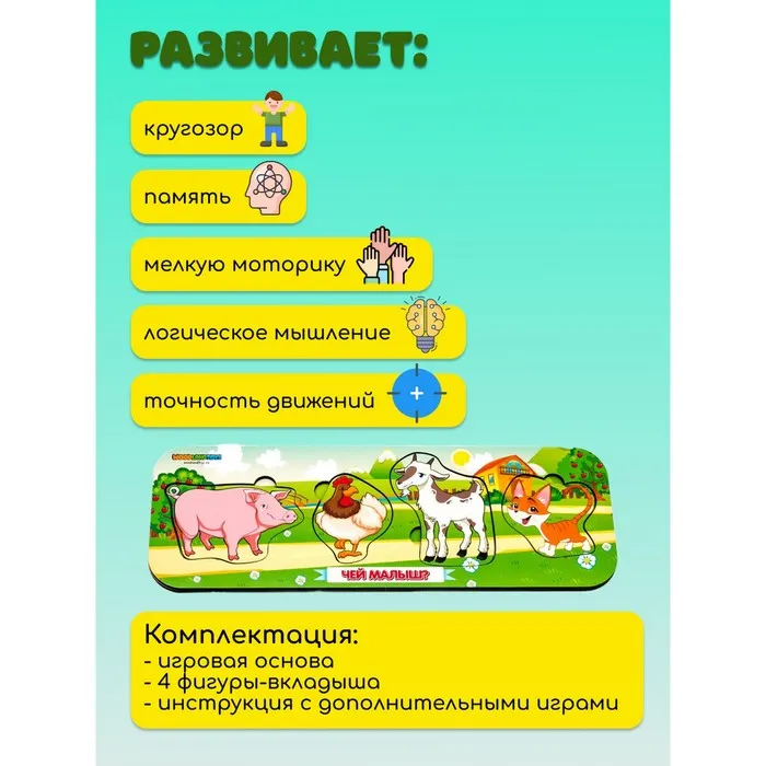 Рамка-вкладыш — это не только увлекательная игра, но и эффективный инструмент для развития важных навыков. Ребёнок учится сопоставлять формы, развивает пространственное мышление и тактильное восприятие. Игра также способствует изучению окружающего мира: родители могут рассказывать малышу о домашних животных, их повадках и среде обитания, делая процесс обучения ещё более интересным и познавательным.