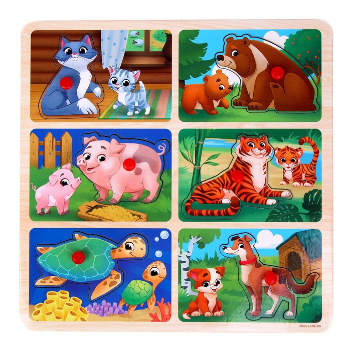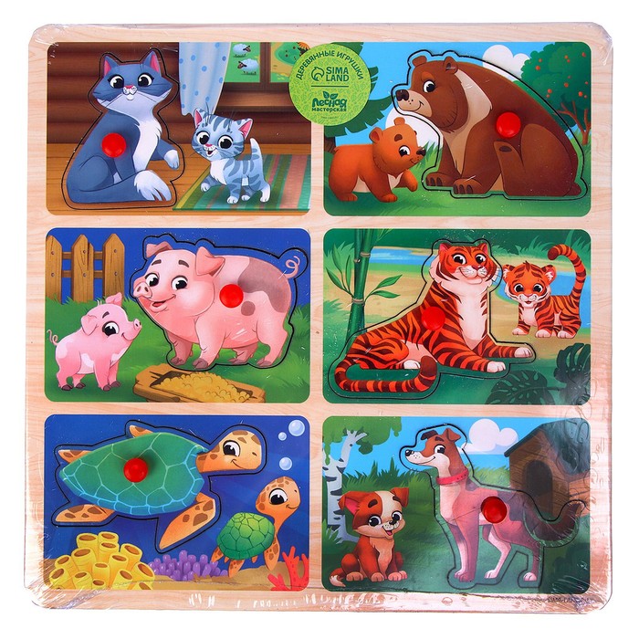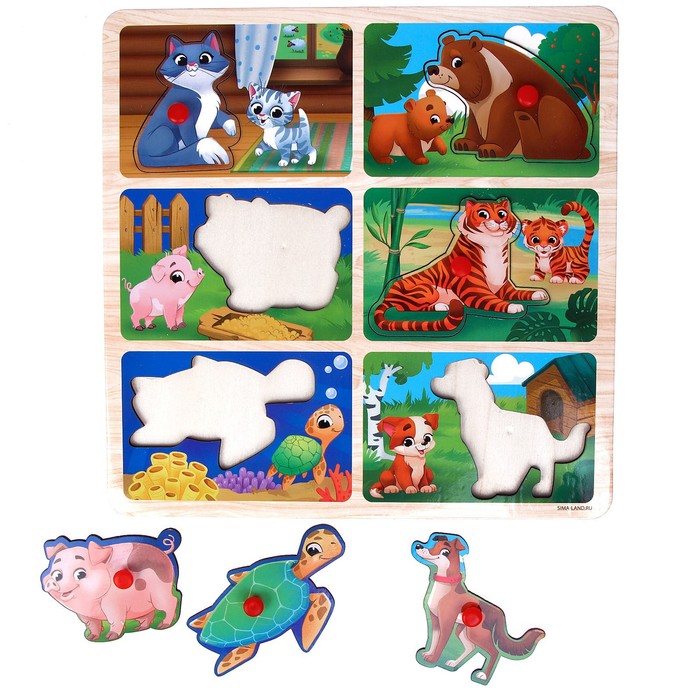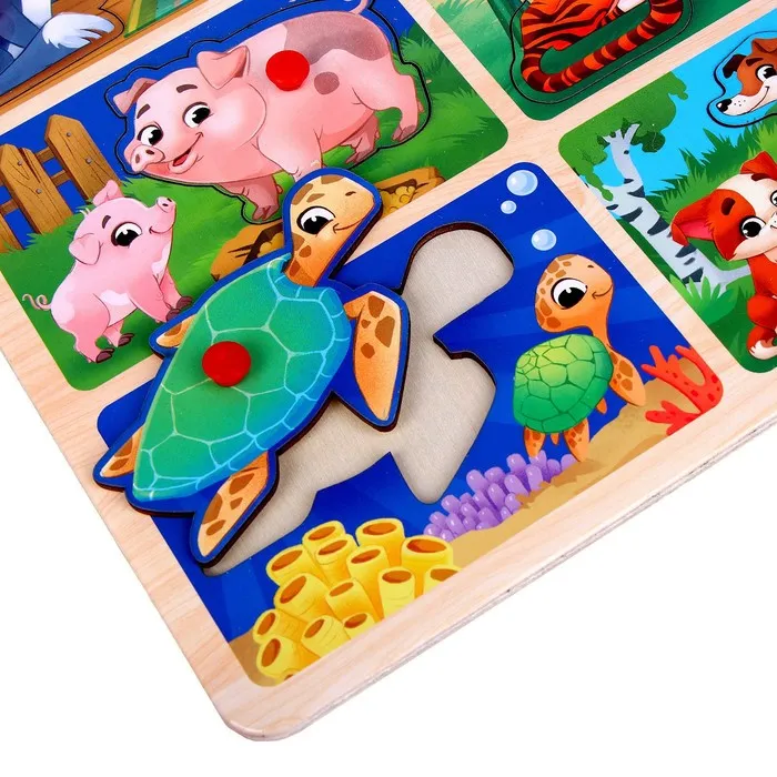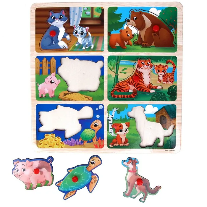 Данная головоломка поможет малышу улучшить сенсорное восприятие, а также изучить животных. Крохе предстоит соотнести элемент вкладки с подходящим отверстием в основе. Хотя эти упражнения кажутся довольно простыми, такие действия очень полезны для развития логического мышления.