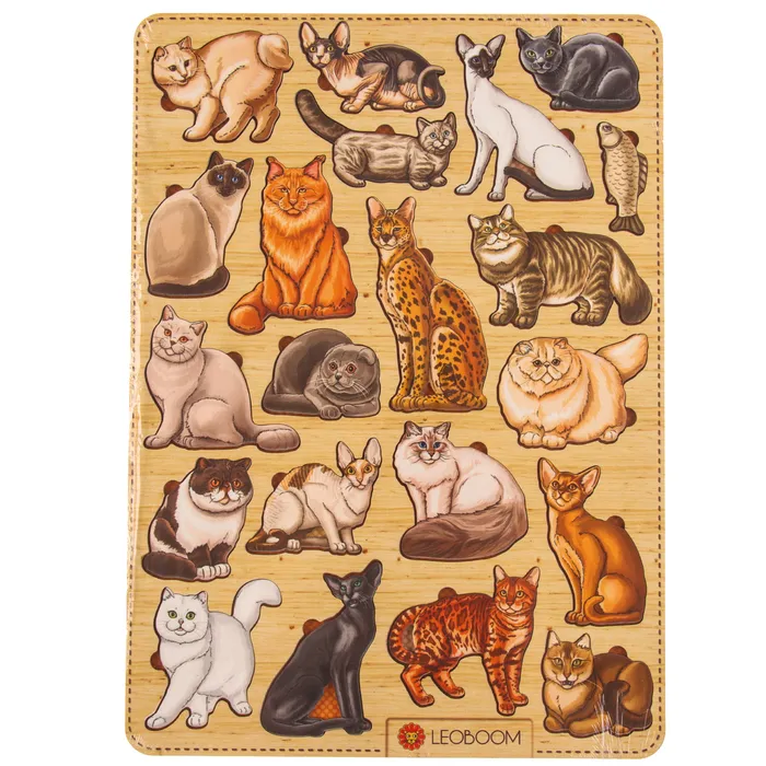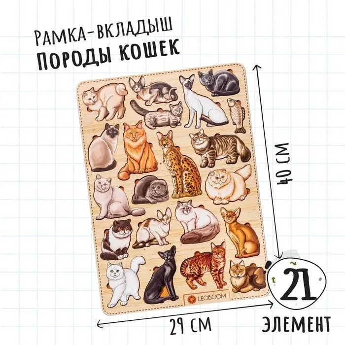 Деревянная рамка-вкладыш «Породы кошек» станет отличным выбором для детей от 3 лет. Игрушка выполнена из натурального дерева, что делает её безопасной, приятной на ощупь и экологичной. Она включает 21 элемент в виде разных пород домашних любимцев, которые нужно вставить в соответствующие выемки, — это увлекательный процесс, который привлекает внимание детей и помогает развивать полезные навыки.
