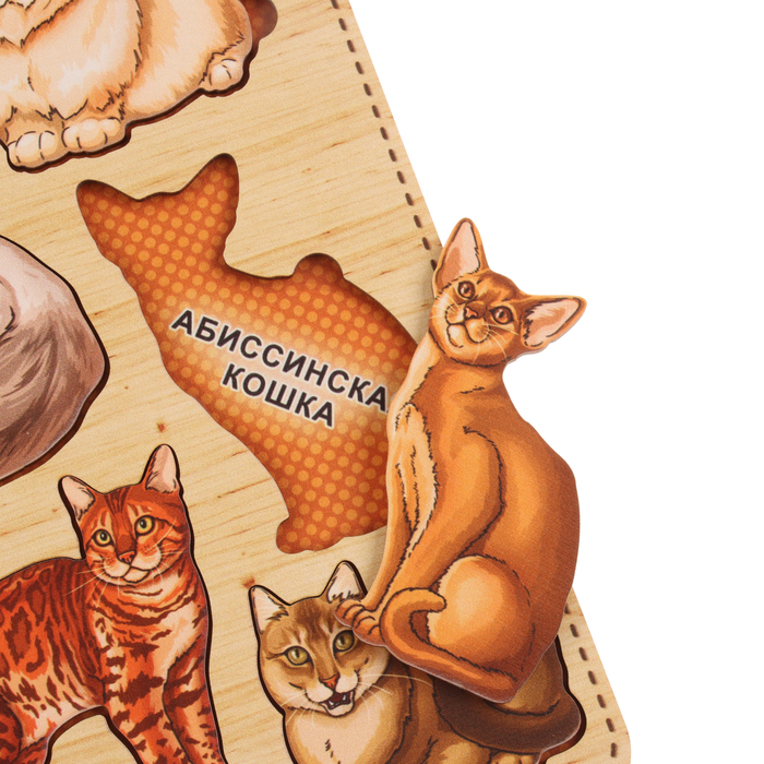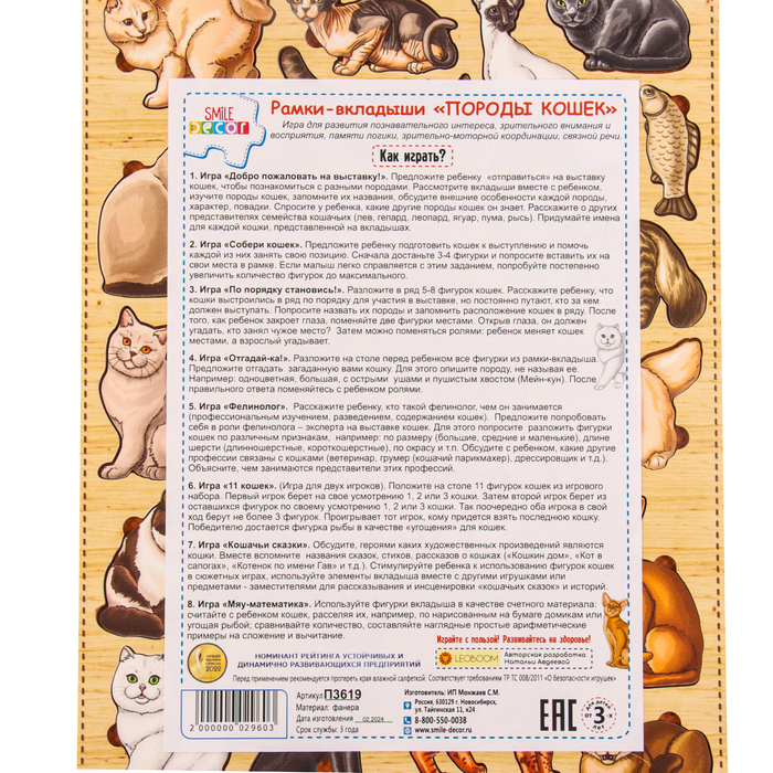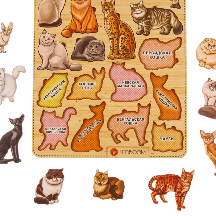 Разместите рамку перед ребёнком и предложите ему подобрать элементы в соответствии с формой. Этот простой процесс помогает ребёнку научиться сосредотачиваться, мыслить логически и решать задачи самостоятельно. Вы также можете сопровождать игру увлекательными фактами или историями о кошечках, изображённых на вкладышах, что сделает процесс обучения ещё интереснее.