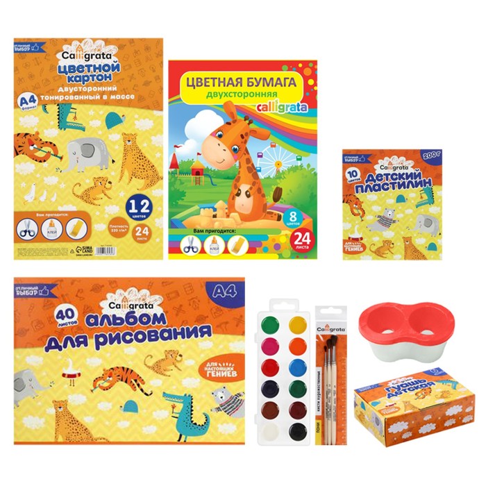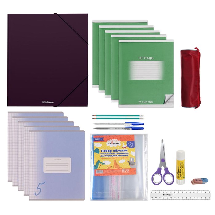 Ручка шариковая, синие чернила - 2 штЛинейка 15 см - 1 штТетрадь 12 листов в клетку - 5 штТетрадь 12 листов в косую линейку - 5 штКраски акварельные 12 цветов - 1Альбом для рисования А4 40 листов на скрепке Calligrata, плотность 100 г/м2 - 1 штПенал мягкий тубус 65 х 210 МИКС - 1 штКарандаш чернографитный - 2 штРезинка стирательная - 1 штНабор обложек 10 шт - 1 штКраски гуашь 6 цв по 20 мл - 1 штНабор кистей Пони 3 шт Calligrata (круглые №: 1,3,5) ручка дерево - 1 штСтакан-непроливайка - 1 штКлей-карандаш 21 гр PVP усиленная формула - 1 штПластилин 10 цв 200 г - 1 штБумага цветная двусторонняя газетная А4 24 л 8 цв плотность 45 г/м² - 1 штНабор картона цветного двустороннего тонированного А4, 24 л 12 цв, плотность 220 г/м2 - 1 штКарандаши 12 цв шестигранные, пластиковые - 1 штНожницы 13 см - 1 штПапка для тетрадей на резинках пластиковая МИКС A5+ - 1 шт