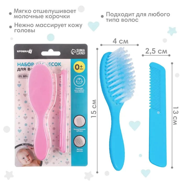 Расческа-щетка с мягкой щетиной и удобная расческа с закругленными зубчиками предназначены для малышей с первых дней жизни.