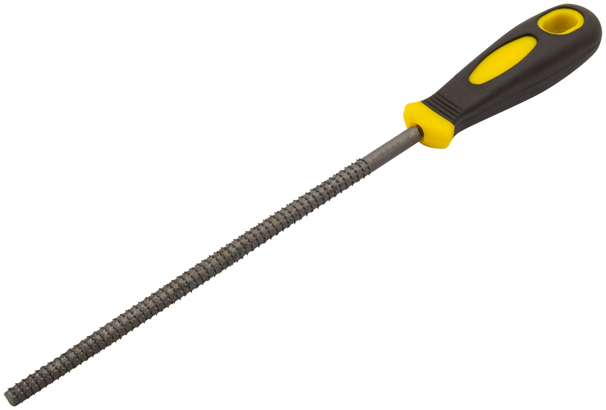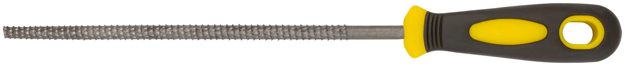 Рашпиль изготовлен из высококачественной инструментальной стали, что гарантирует его долговечность и устойчивость к износу. Прорезиненная ручка обеспечивает комфортное и надежное удержание инструмента даже при длительной работе.