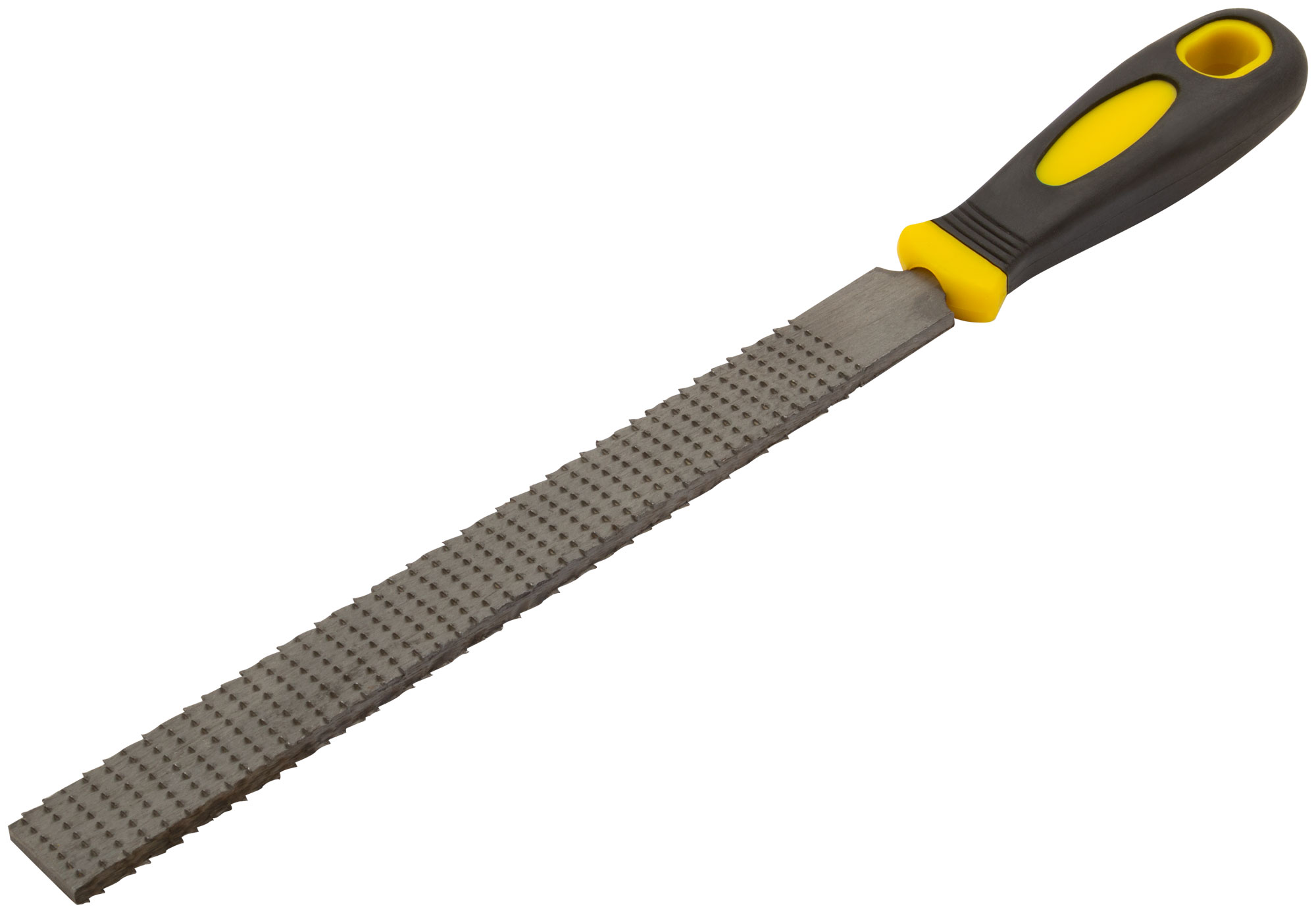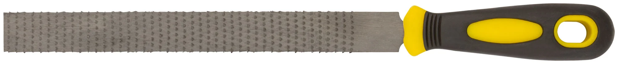 Рашпиль изготовлен из инструментальной стали, что обеспечивает его долговечность и стойкость к истиранию. Прорезиненная рукоятка обеспечивает надежный хват, снижая риск скольжения в процессе работы.