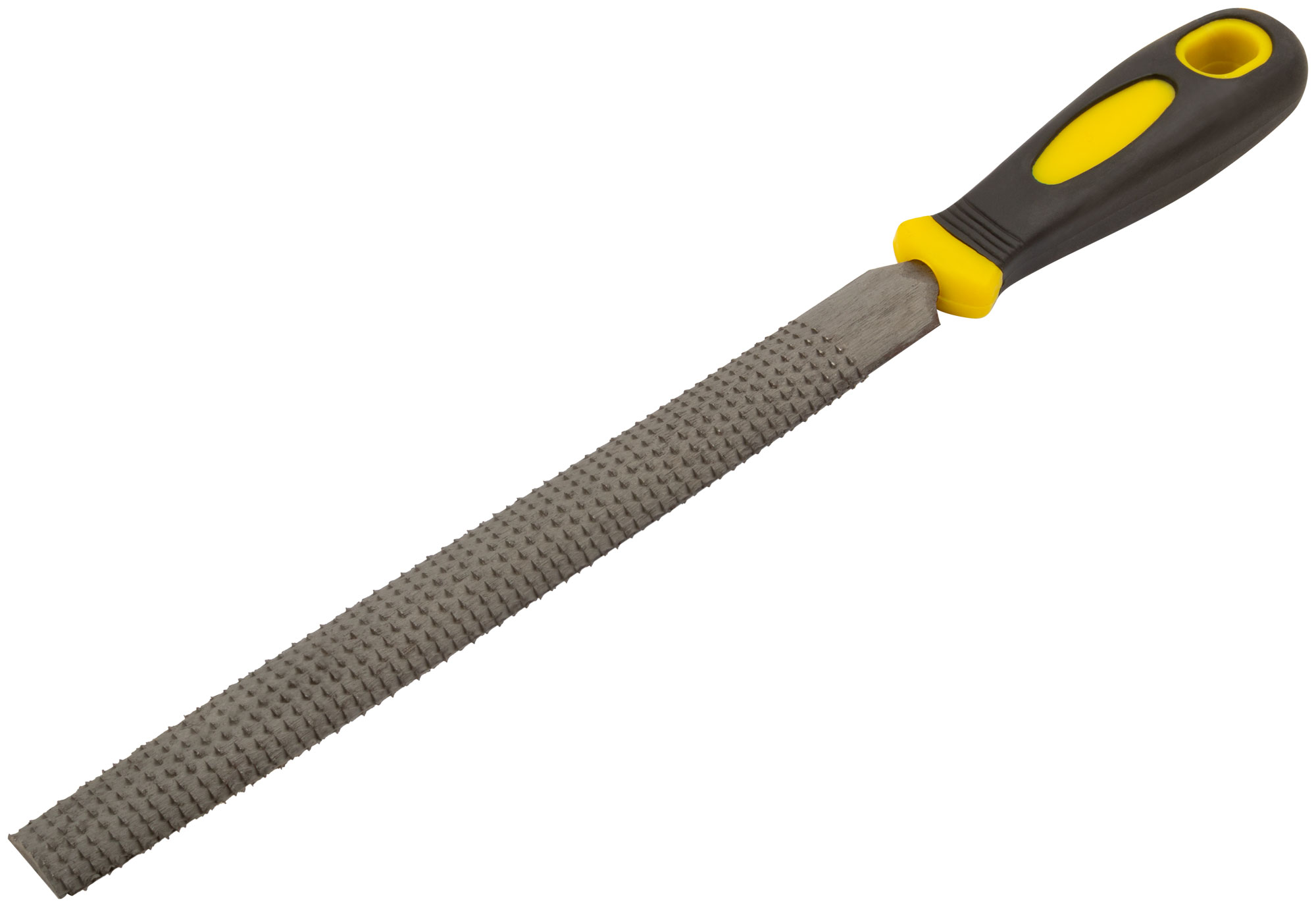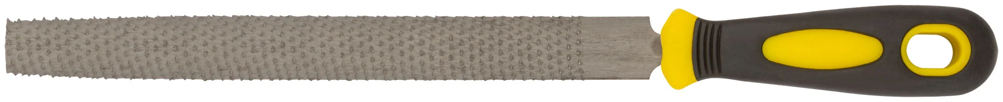Рашпиль выполнен из высококачественной инструментальной стали, что обеспечивает долгий срок службы и надежность в работе. Прорезиненная ручка обеспечивает комфортное сцепление и уменьшает усталость руки при длительном использовании, что особенно важно при интенсивной работе.