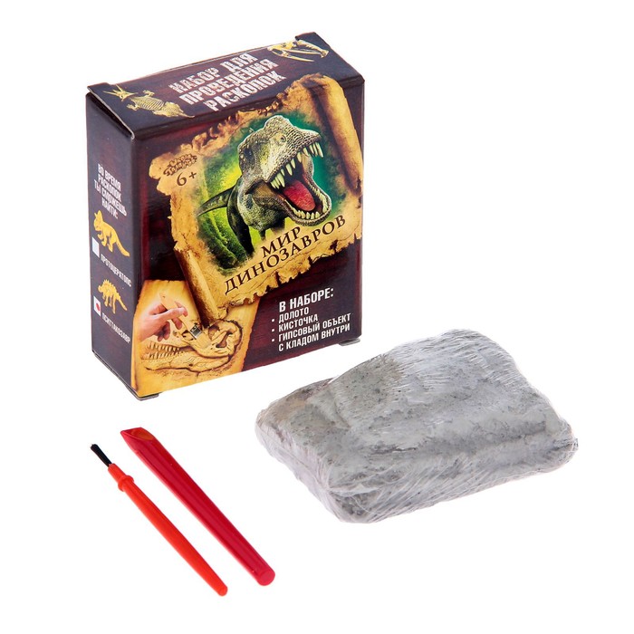 В наборе: долото, кисточка, гипсовый объект с кладом внутри.