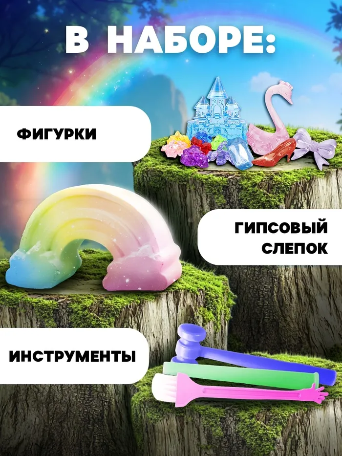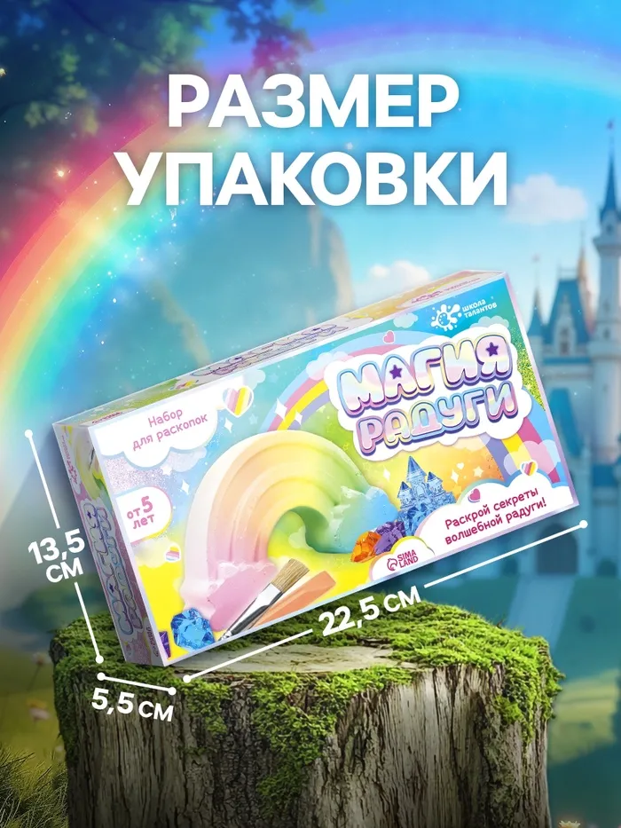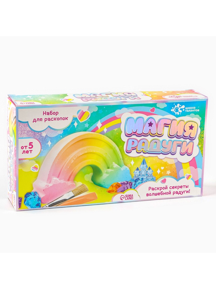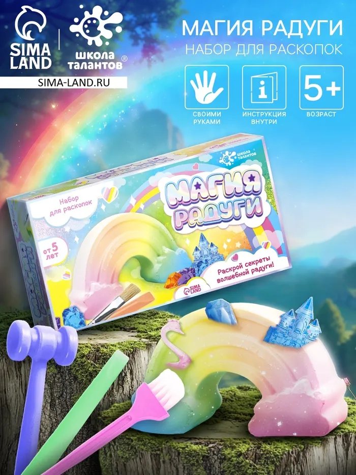 «Магия радуги» — это набор, в котором малыша ждут сверкающи кристаллы. В пути к их спасению ваш ребёнок сможет ознакомиться с навыками археологии и палеонтологии и проявит интерес к познанию окружающего мира! Этот набор — не просто игрушка, а настоящая находка для развития ребёнка.