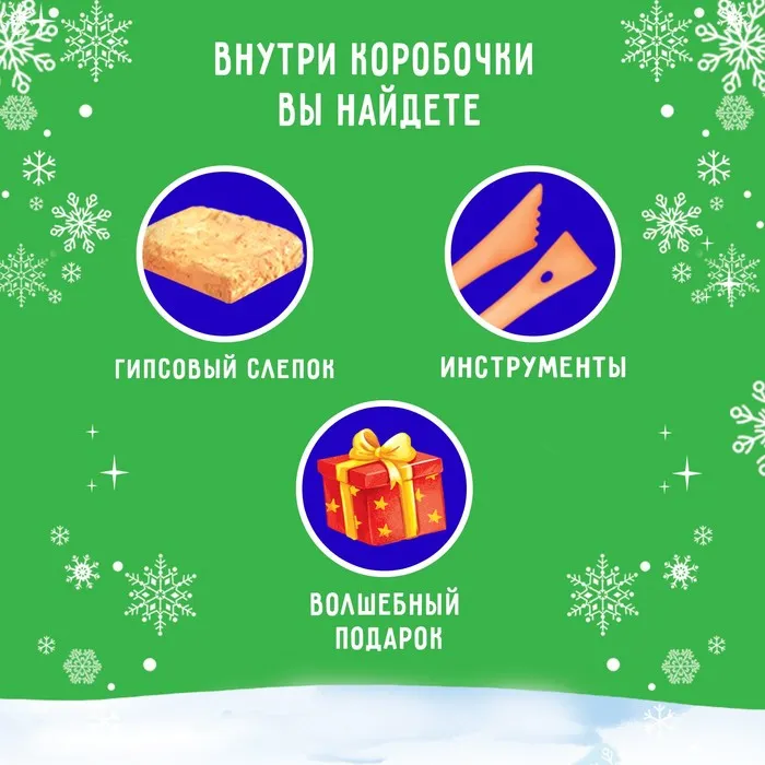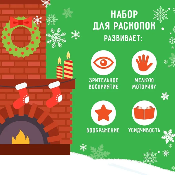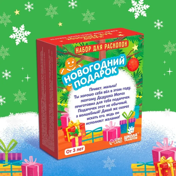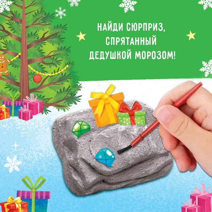 Набор для раскопок позволит ребёнку почувствовать себя настоящим археологом, который отправится в новогоднюю экспедицию и отыщет сокровища, спрятанные Дедушкой Морозом.