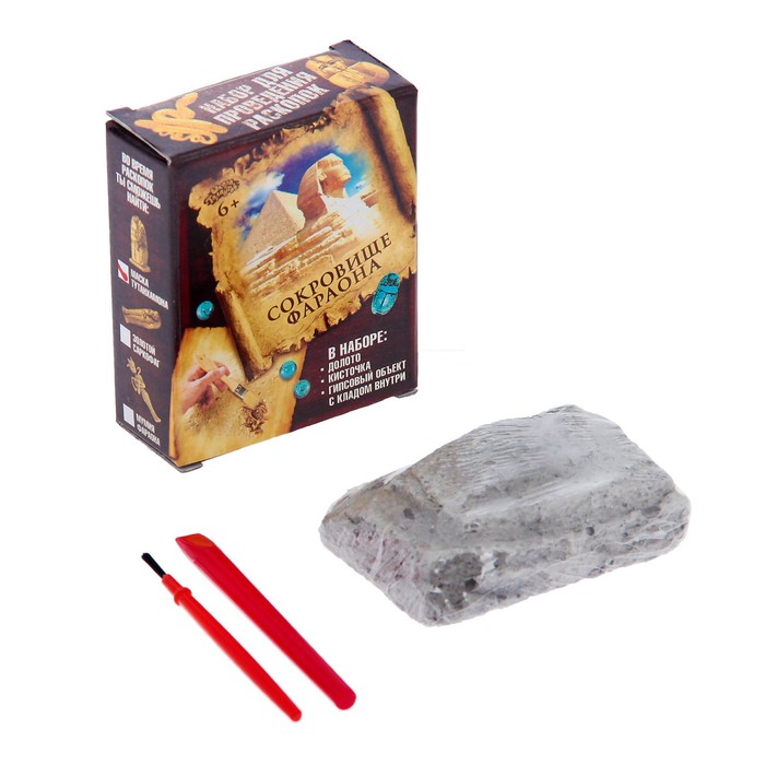 В наборе есть кисточка, долото, гипсовый объект с маской Тутанхамона внутри.