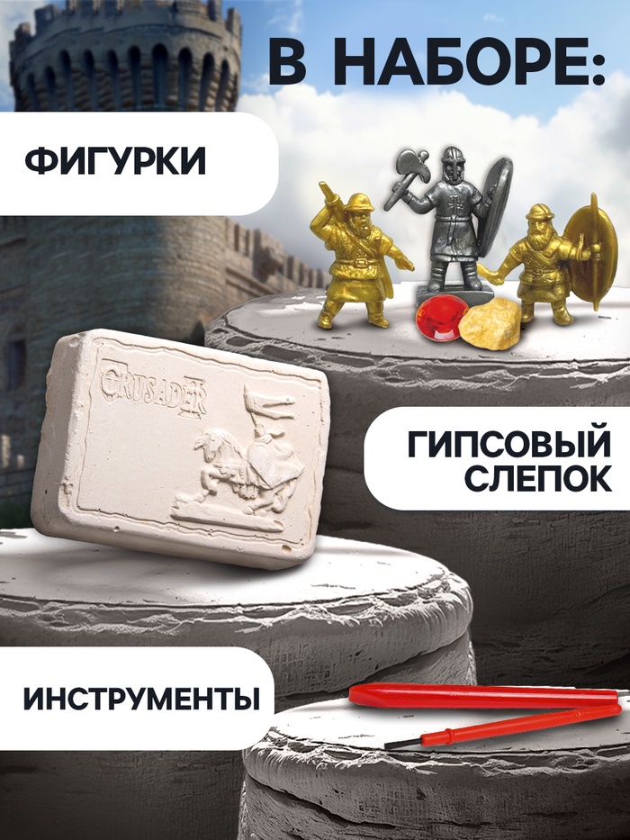С набором «Тайны средневековья» у ребёнка есть возможность устроить раскопки прямо у себя дома. Благодаря этому ребёнок научится познавать прошлое, а подогреет его мотивацию к познаниям интересная игрушка внутри гипсового слепка.
