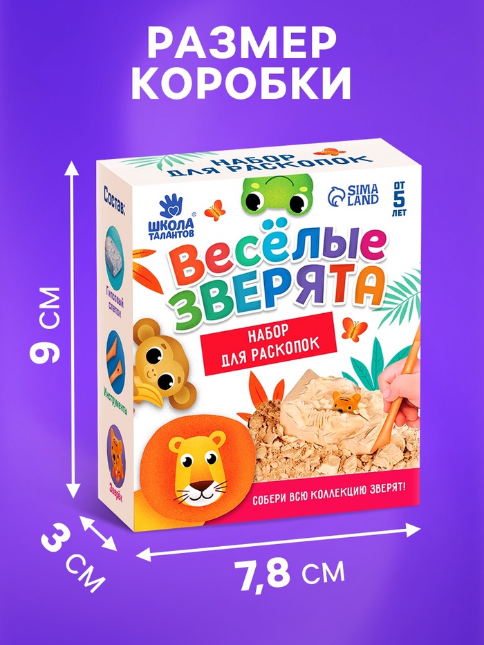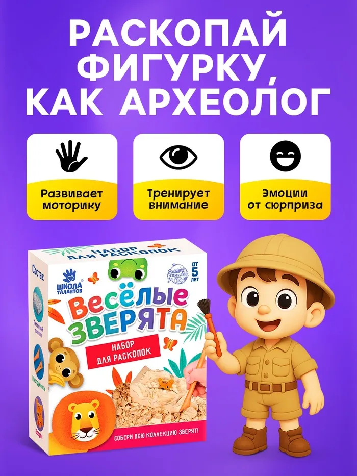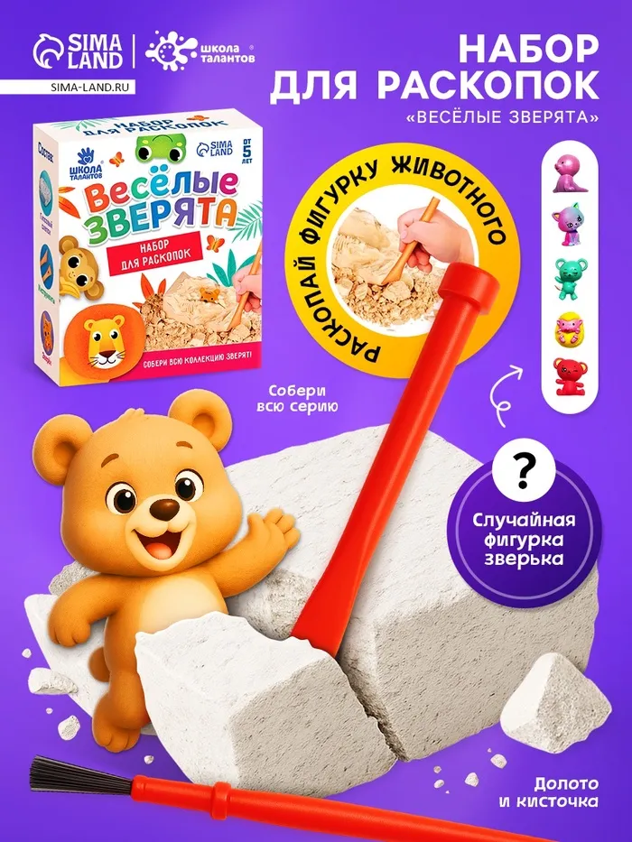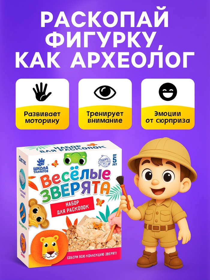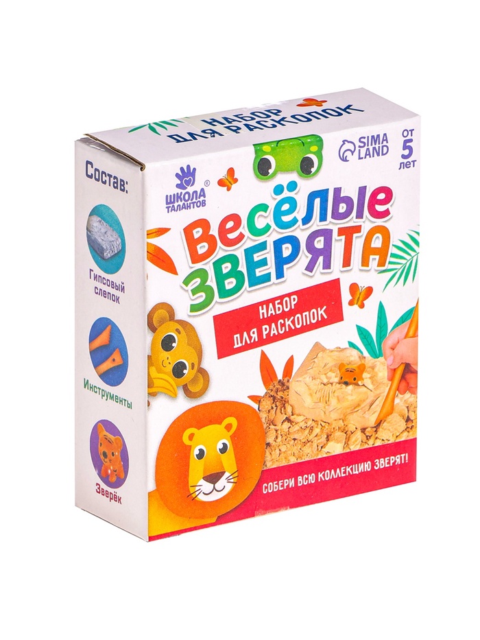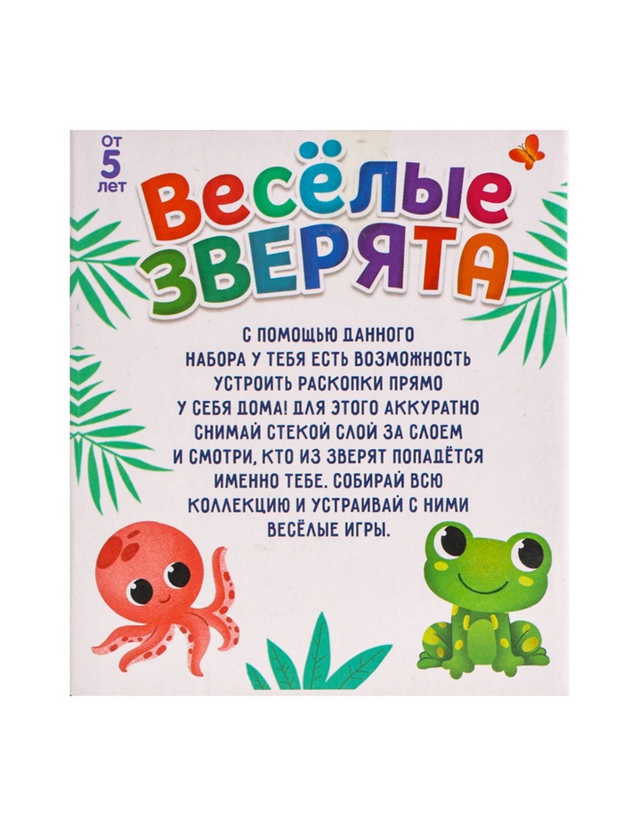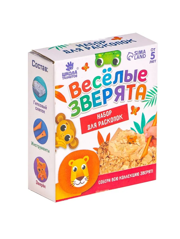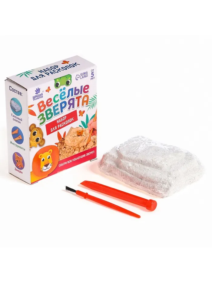 С набором из серии «Весёлые зверята» у ребёнка есть возможность устроить раскопки прямо у себя дома! Для этого нужно аккуратно снимать гипс стекой слой за слоем. А внутри слепка ждёт сюрприз.