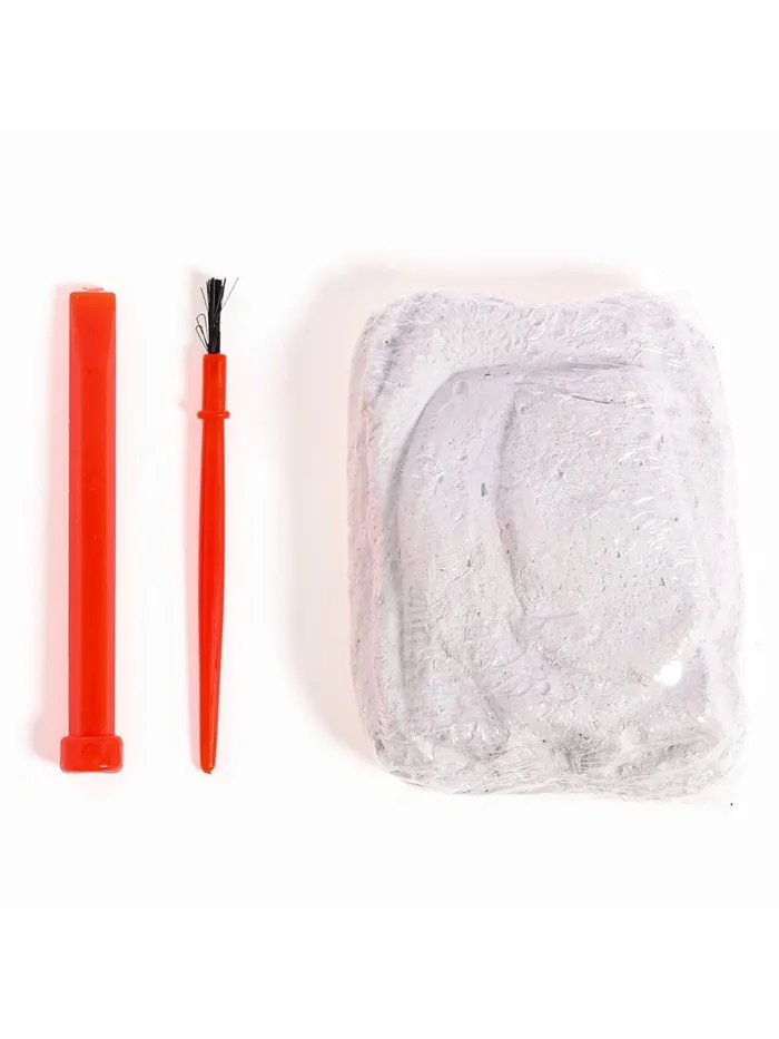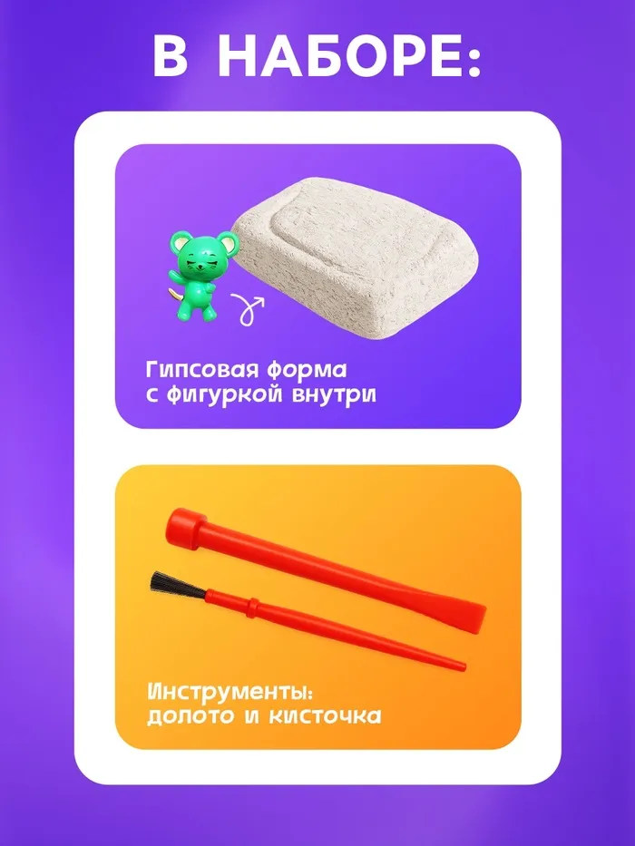 В наборе есть кисточка, долото, гипсовый объект с фигуркой животного внутри.