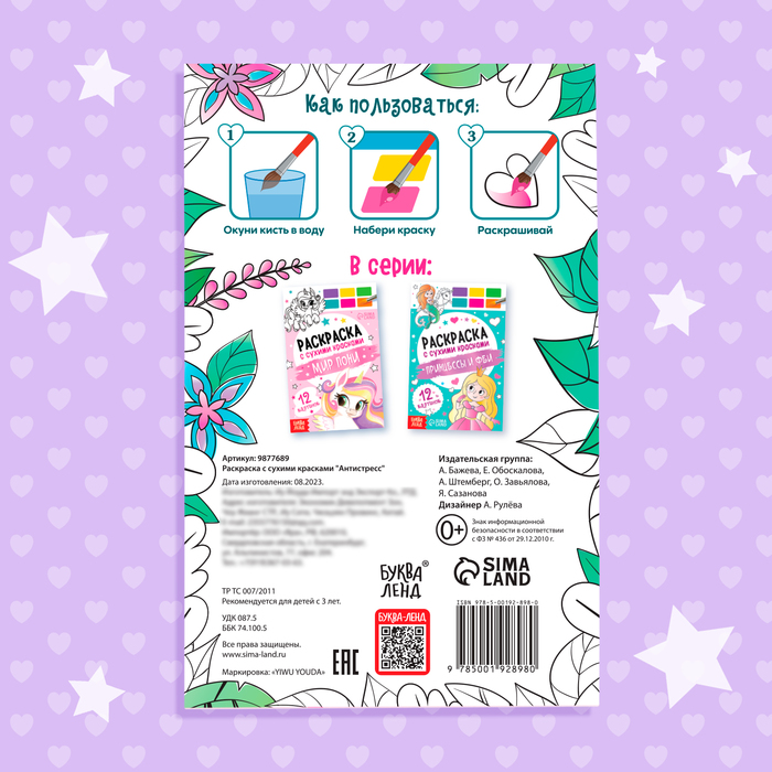 Раскраска акварельная «Антистресс», с сухими красками и кисточкой, 3+ — Характеристики