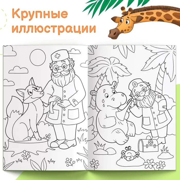 Раскраска создана по мотивам сказок Корнея Ивановича Чуковского. Внутри вы найдёте персонажей из произведений «Ай-болит», «Муха Цокотуха», «Мойдодыр» и другие.