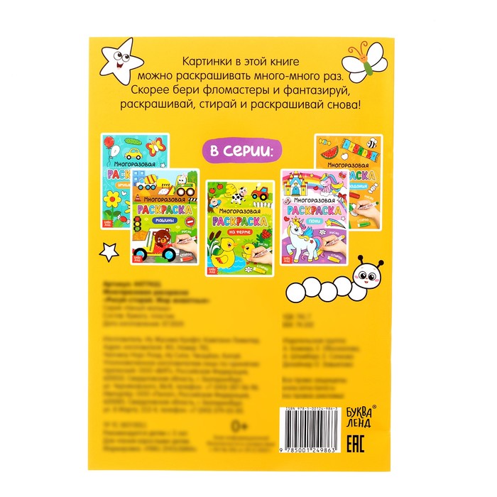 Многоразовая раскраска «Рисуй-стирай. Мир животных» станет увлекательным занятием для детей от 3 лет. Эти 12 многоразовых страниц с яркими изображениями зверушек подарят ребёнку возможность творить снова и снова.