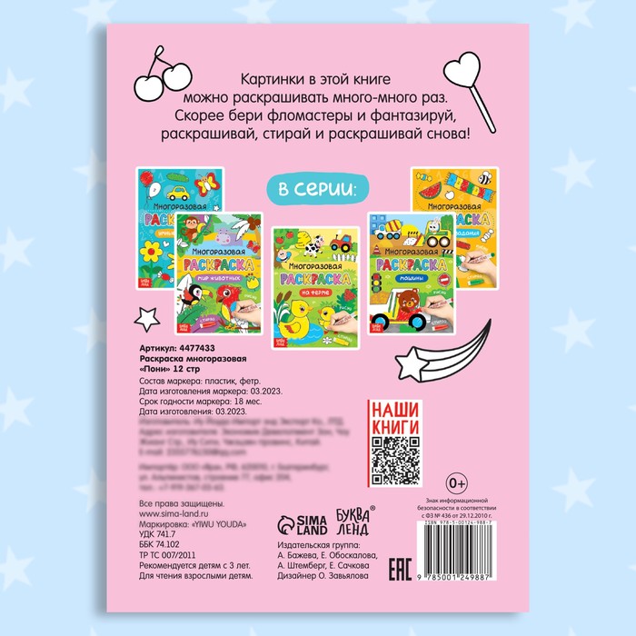 Раскраска для девочек «Рисуй-стирай. Пони», 12 стр., многоразовая, с маркерами — Характеристики