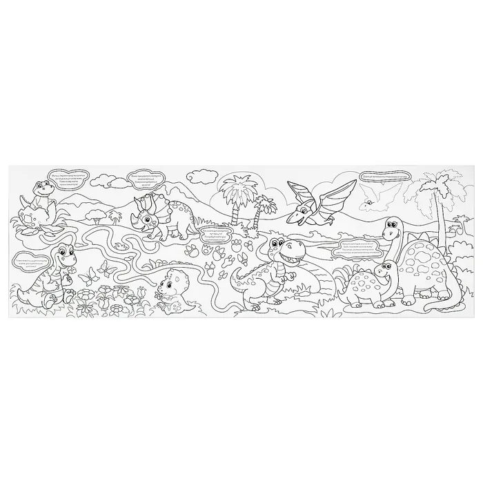 Длинная раскраска «Мир динозавров» — это неограниченное поле для творчества малыша, возможность в игровой форме потренировать полезные навыки и познакомиться с древними рептилиями.