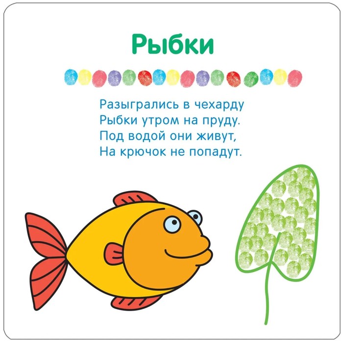 Прочитайте ребёнку стихотворение, назовите изображение и предложите порисовать вместе. Если ваш малыш рисует пальчиками впервые, возьмите его руку в свою, обмакните пальчик ребёнка в краску и покажите, как нужно ставить на картинке пятнышки-отпечатки, заполняя ими контур изображения. Очень скоро малыш научится самостоятельно рисовать пальчиками.