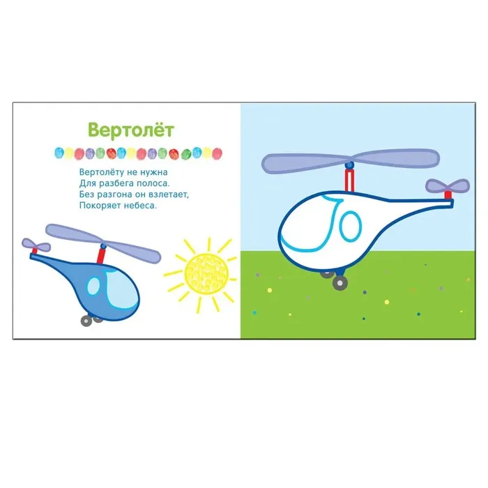 Красочные крупные иллюстрации, простые знакомые сюжеты и веселые стихи познакомят малыша с самолетом, автомобилем, воздушным шаром и другими видами транспорта.