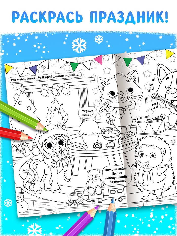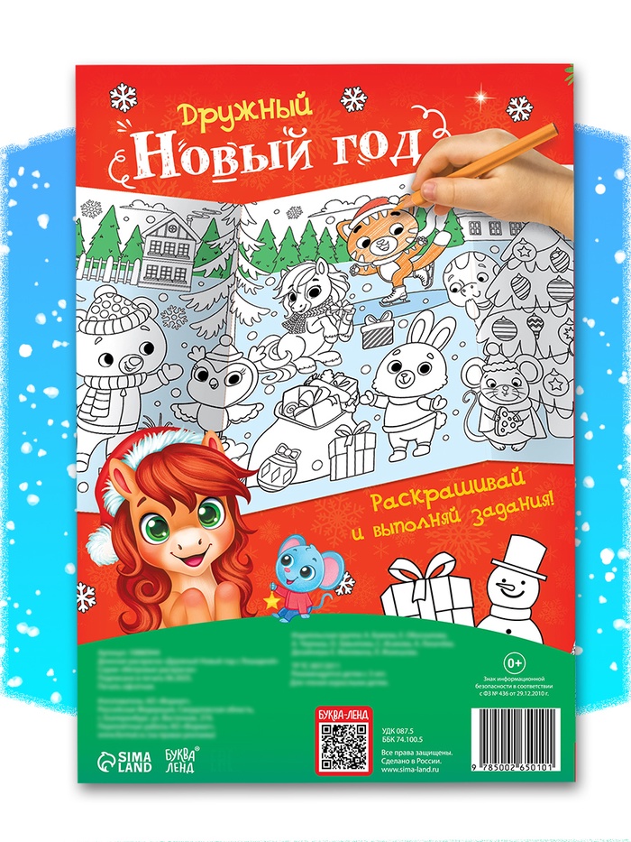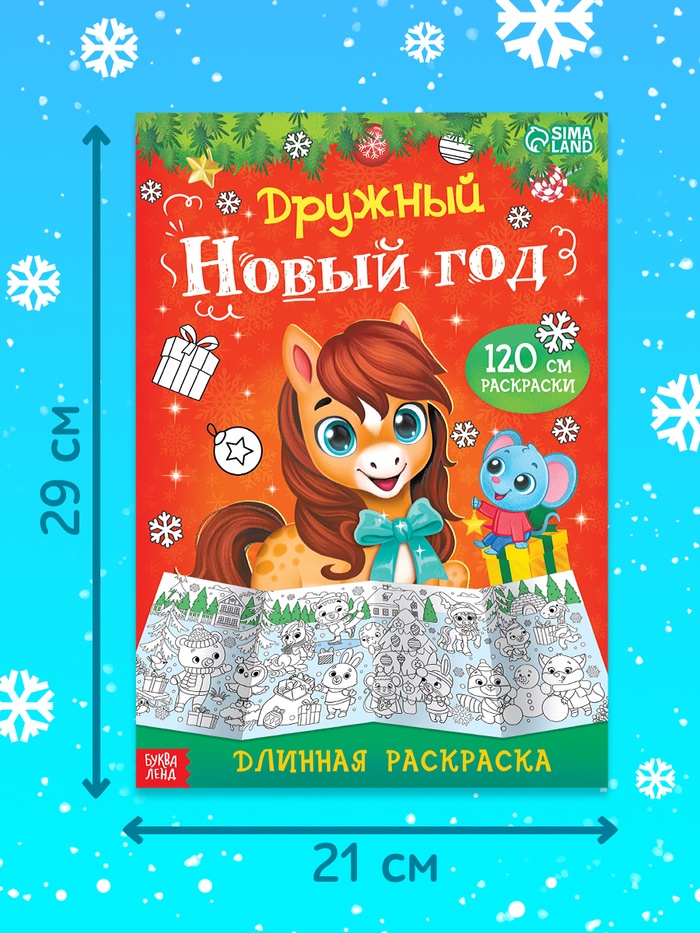 Длинная раскраска «Дружный Новый год с Лошадкой» — это яркий плакат длиной 120 см, наполненный весёлыми новогодними сюжетами и несложными заданиями. На ней ребёнок найдёт увлекательные задачки, такие как «Помоги ёжику найти потерявшийся вагончик» или «Раскрась гирлянду в правильном порядке». Это издание станет не только источником радости, но и способом развить логическое мышление, мелкую моторику и внимание к деталям.