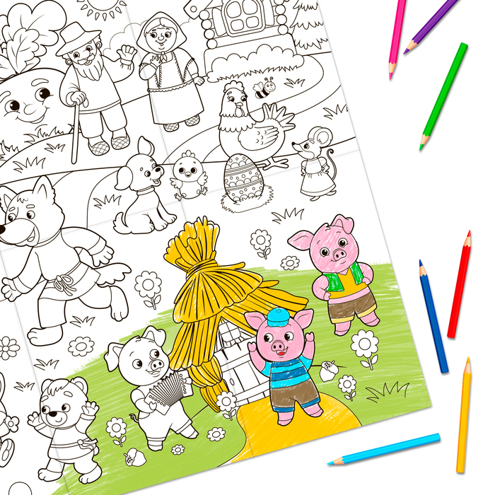 Раскраска гигант «Мы пришли из сказки» — это отличная возможность для детей весело провести время, развивая моторику и фантазию.