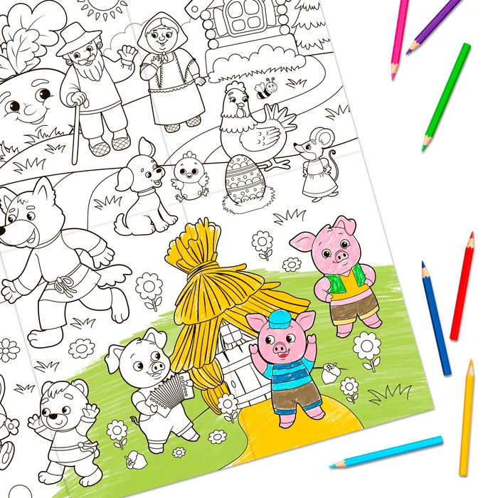 - Плакат большого размера предоставляет обширное поле для раскрашивания, где малыш может экспериментировать с карандашами или акварелью.